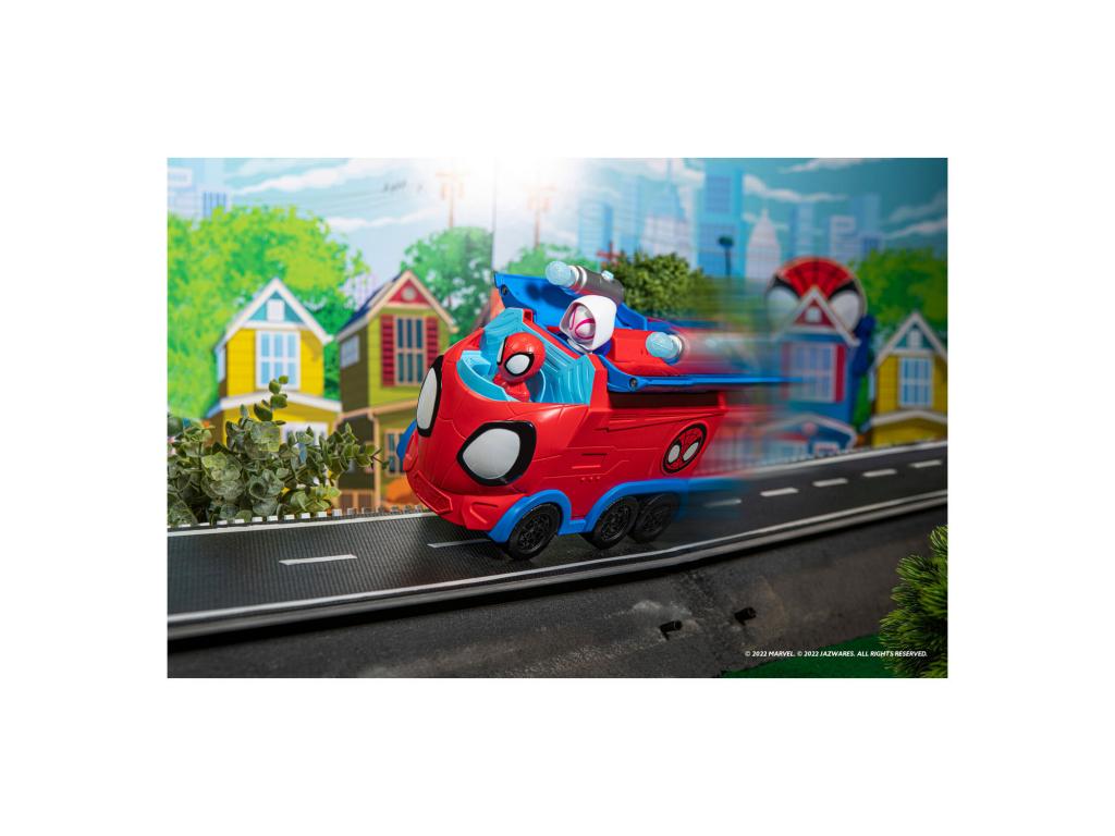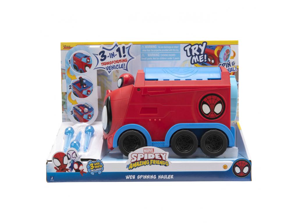 Spidey vezet, míg Ghost és Miles két hálóvetőt kezel. Forgasd el a hátsó forgógombot a jobb oldali szimbólumra, és Ghost vagy Miles kijön a tetőből a saját hálóvetőjével. Nyomd meg a gombot, hogy háló nyilat lőj ki egy gonosztevőre. Forgasd vissza a forgógombot a Spidey szimbólumra, és a jármű teteje bezárul, miközben Spidey üldözni kezdi a gonosztevőket. Gyűjtsd össze ezt az átalakítható 3 az 1-ben járművet és más játékokat a Marvel's Spidey and His Amazing Friends sorozatból.