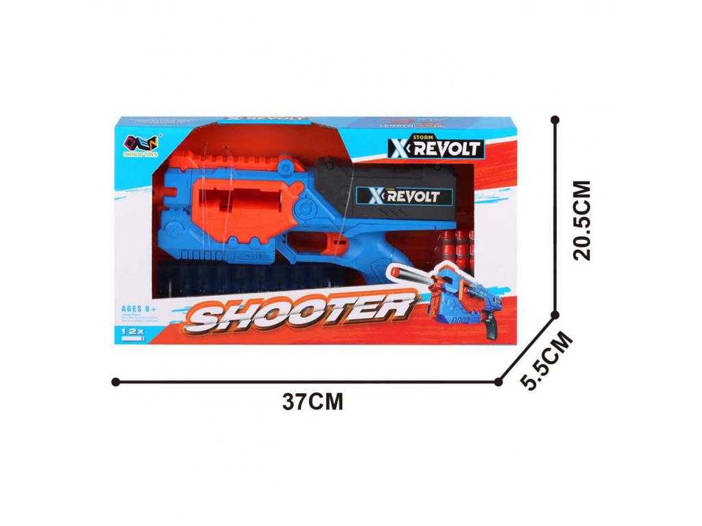 A Shooter X Revolt egy kompakt műanyag blaster, mérete kb. 37 x 20,5 x 5,5 cm, 12 puha darts nyilakkal együtt. A blaster könnyű és kézreálló. 6 éves kortól alkalmas.