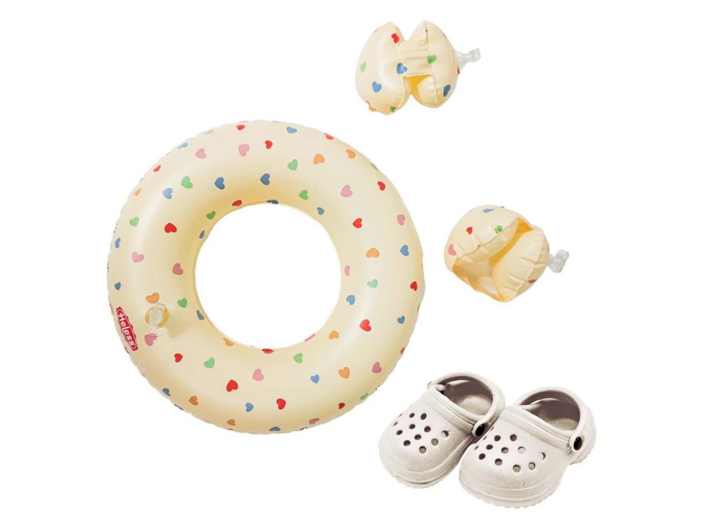 A Szívkonfetti babaúszó szett mindent tartalmaz, amire a babaszülőknek szükségük lehet, amikor kis kedvencükkel csobbannak a vízben. A szett tartalmaz egy úszógumit, babaszárnyakat édes szív alakban és divatos fürdőpapucsokat finom bézs színben.