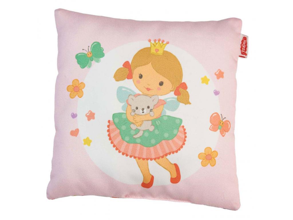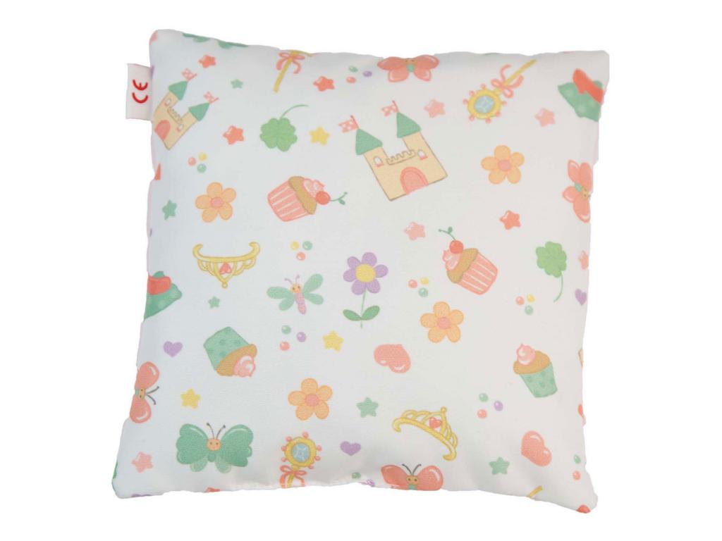 A kétoldalas takaró (44 x 34 cm) és a kétoldalas párna (16 x 16 cm) két elbűvölő mintával rendelkezik: az elülső oldalon Emily hercegnő Levi herceggel és Kitty cicájával egy nyári réten táncol, a hátsó oldalon pedig vidám, színes, teljes felületet borító nyomtatás látható.