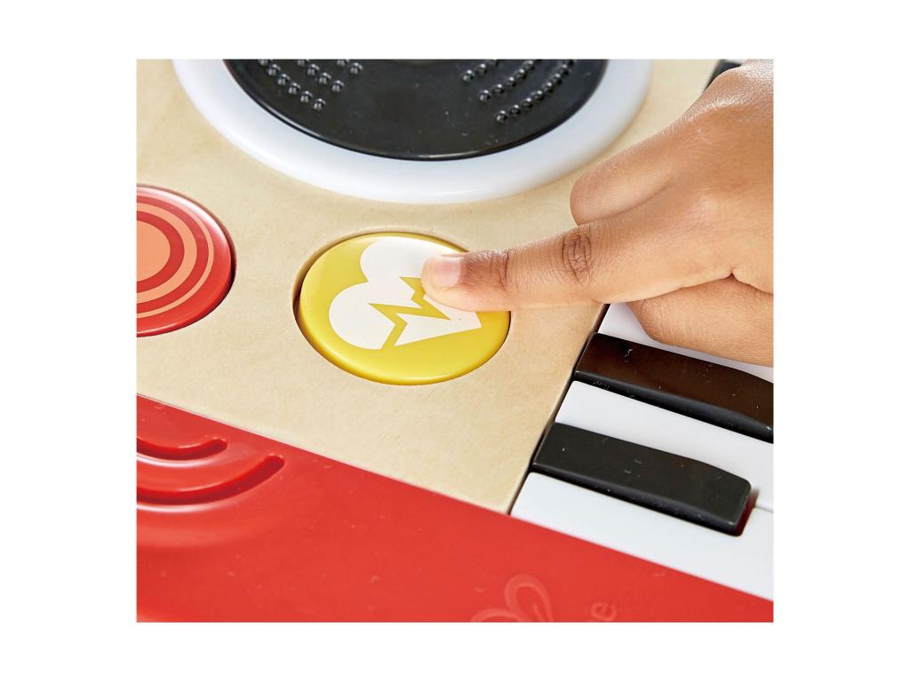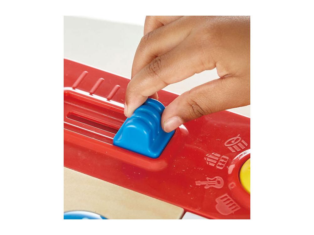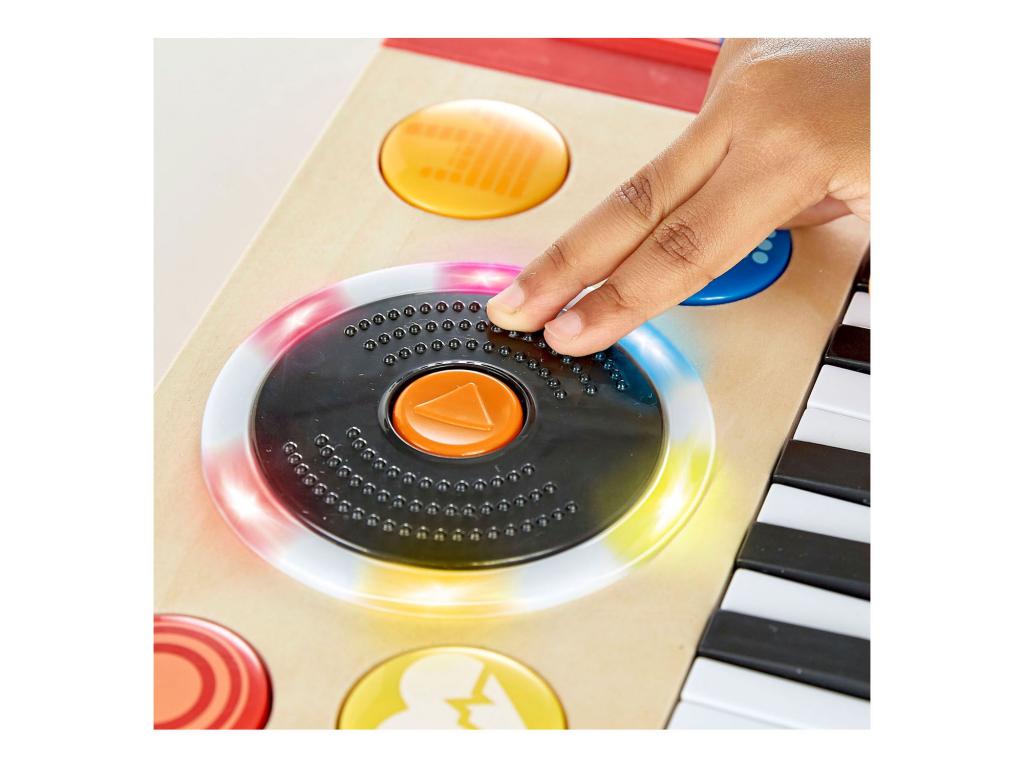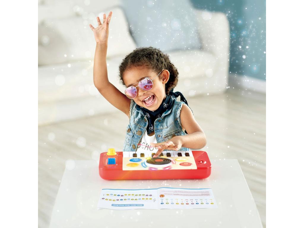 DJ-játék 18 hanghatással, 5 háttérzenével és 4 hangszeres hanggal. Keverje, keverje és kombinálja a hangokat, hogy a legmenőbb zenét hozza létre! 3 AA elemmel működik. A DJ-készlet fából készült, mérete 34 x 18,5 x 4 centiméter. 12 hónapos kortól alkalmas.
