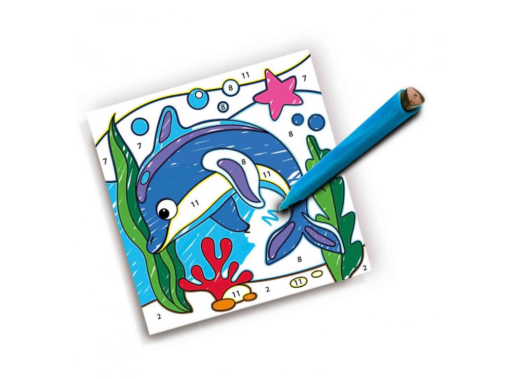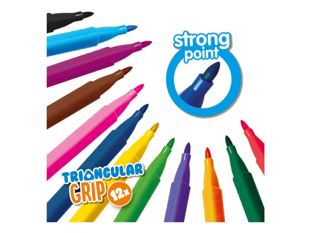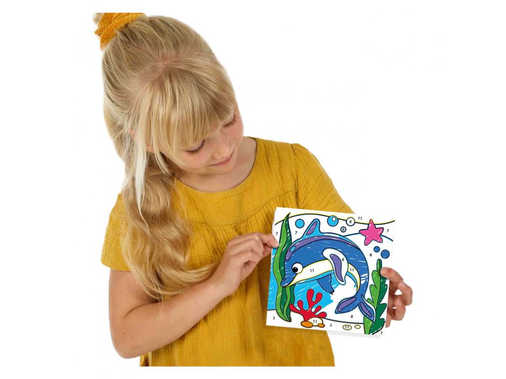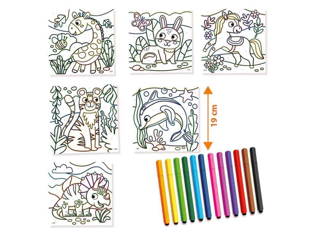 Festés számok szerint! A háromszög alakú filctollak arra ösztönzik a gyerekeket, hogy a tollakat helyesen fogják meg. A filctollak 12 élénk színben kaphatók és stabil hegyük van. Ezekkel a kifestőkönyvekkel a gyerekek számról számra kifesthetik a vidám illusztrációkat. A legkisebbeknek a dobozok körül lévő színes vonalak nyújtanak további segítséget. Így a kifestés mindig örömteli, és a 6 kifestőkönyv könnyedén teljesen kifesthető.
