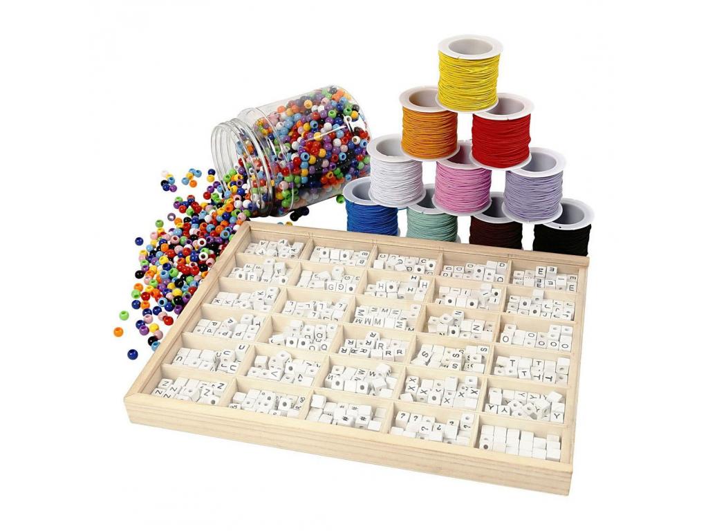Ez a karkötőkészlet mind a nyelvi, mind a numerikus ismeretek fejlesztését segíti elő. Betűgyöngyökkel lehet szavakat és neveket betűzni, valamint a karkötőt méretre vágva és a gyöngyöket sorrendbe és mennyiség szerint rendezve. Tartalom: 10 színű gumiszalag 25 m-es tekercsben, 425 g műanyag gyöngy és 750 fa betűgyöngy kb. 80 karkötő elkészítéséhez elegendő