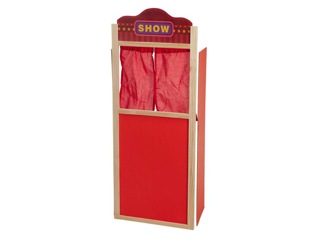 Fa bábjáték színház piros függönnyel és stabil állvánnyal. Ideális kéz- és ujjbábokhoz. 3 évesnél idősebb gyermekek számára alkalmas. Méretek: kb. 90,5 x 39,5 cm.
