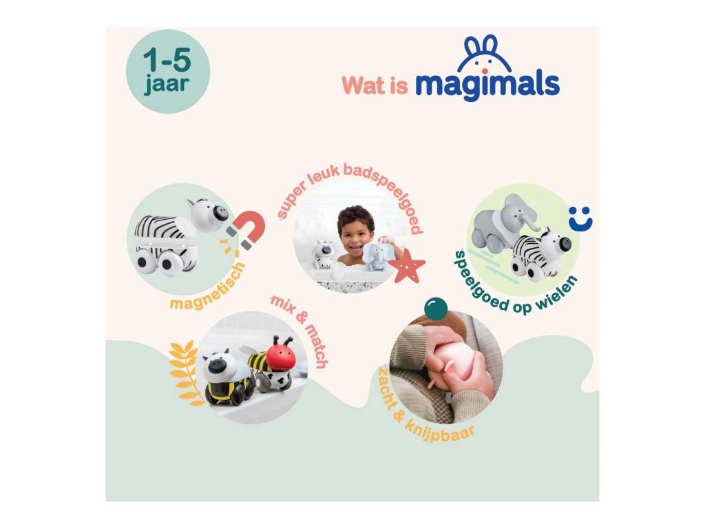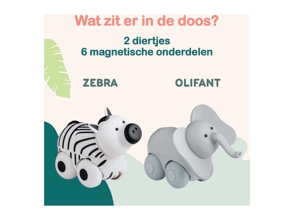 A Magimals Wheely Safari Box egy zebrát és egy elefántot tartalmaz, 6 mágneses részből áll. Puha, harapásálló anyagból készült, 1-5 éves gyermekek számára alkalmas. Ideális keveréshez, kombináláshoz és kreatív játékhoz.