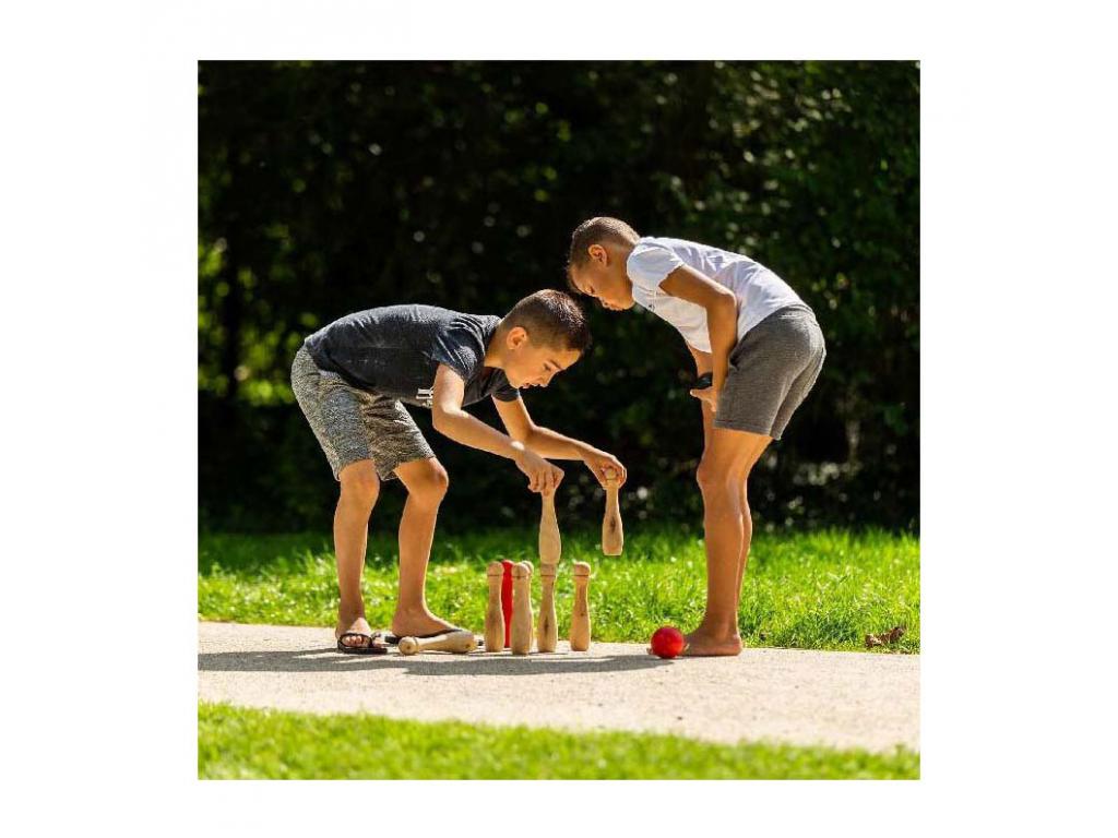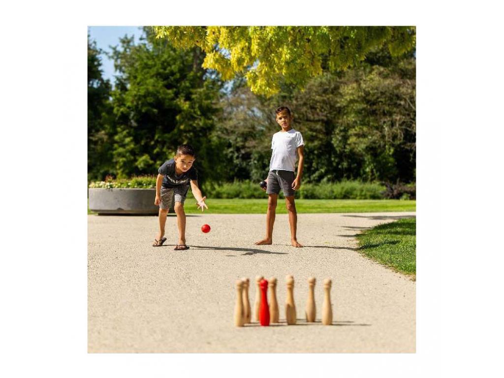 Kerti bowling. Dobjon le két körben minél több bábut. Strike! A legtöbb pontot szerző nyer. A szett 9 bábuból (20 x 5 cm) és 2 db 7,5 cm átmérőjű golyóból áll. Anyag: fa. Szállítás részletes használati utasítással, FSC-tanúsítvánnyal rendelkező dobozban és tárolótáskában. 3 éves kortól alkalmas.