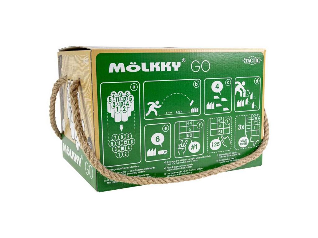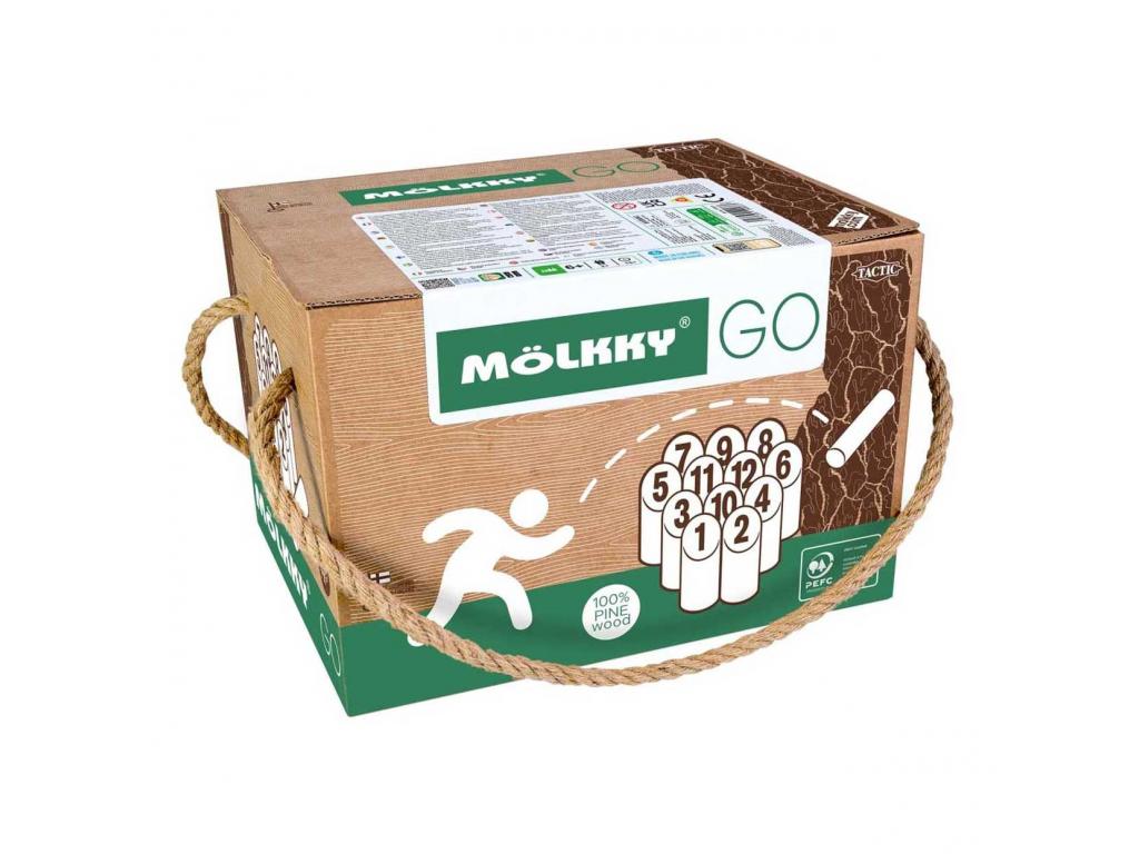 Kompakt Mölkky GO készlet 12 kúppal és egy tömör fenyőfából készült dobó bottal, hordtáskában (25,5 x 19 x 17 cm). 2 vagy több játékos számára, 6 éves kortól. Robusztus és könnyen hordozható.