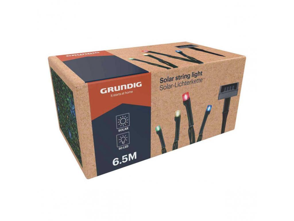 Napelemes fényfüzér 50 többszínű LED-del. A fényfüzér hossza 6,5 méter, kültéri használatra alkalmas.