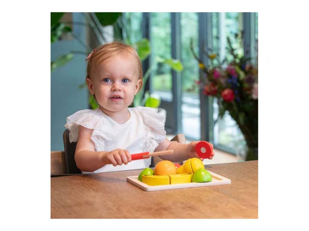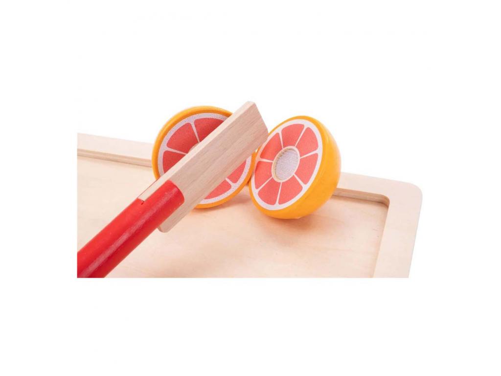 Legyen igazi szakács ezzel a fa vágókészlettel! A készlet tartalmaz egy vágódeszkát, egy kést, egy almát, egy körtét, egy banánt, egy lime-ot és egy grapefruitot. A gyümölcsök tépőzárasak, így szét lehet vágni és újra össze lehet állítani őket.