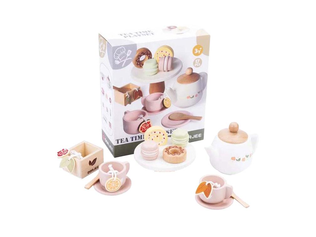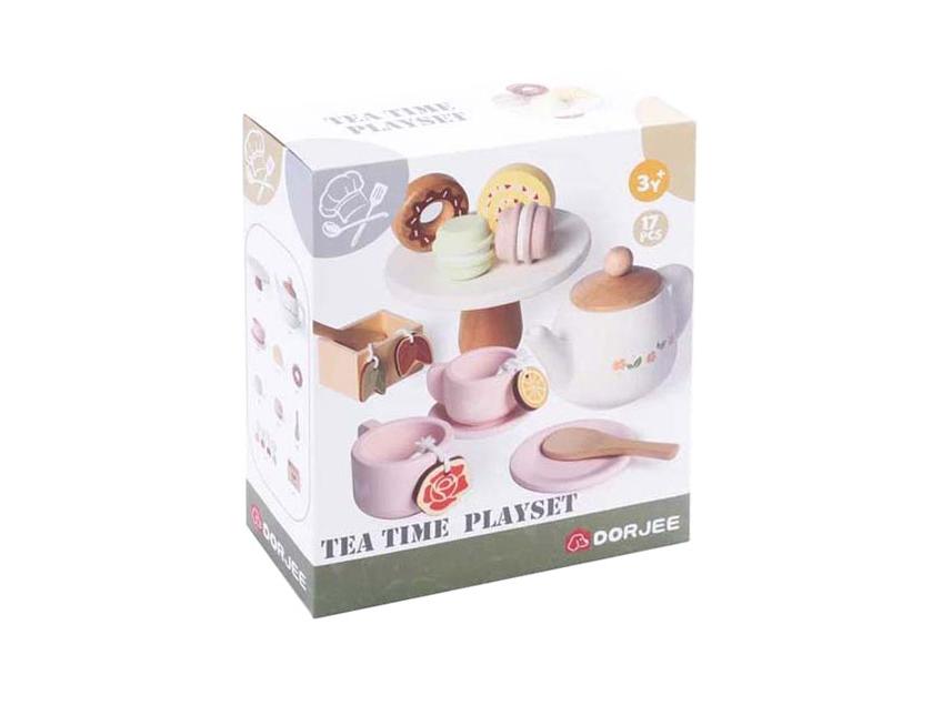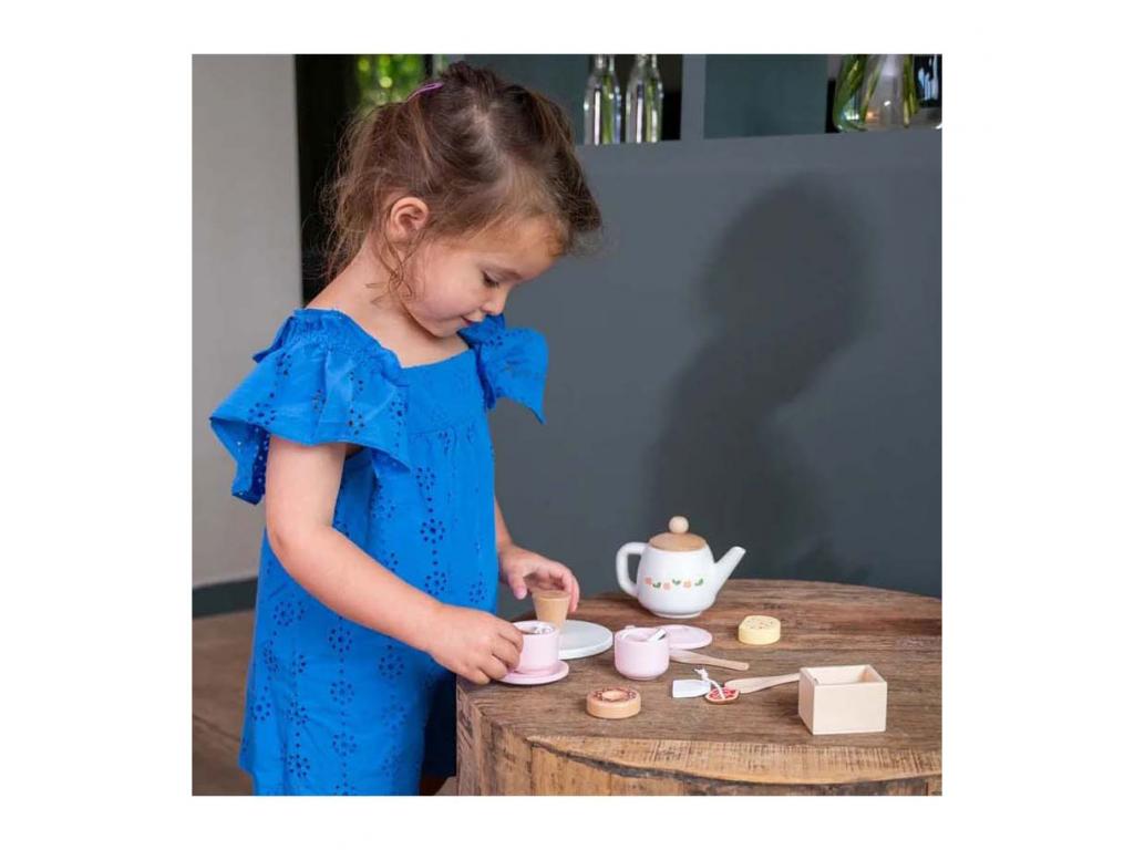 A Dorjees fa teáskészlet tökéletes egy játékos teázáshoz. A készlet tartalmaz egy elegáns teáskannát, teáscsészéket, kanalat, teafiltert és finom fa kekszeket.