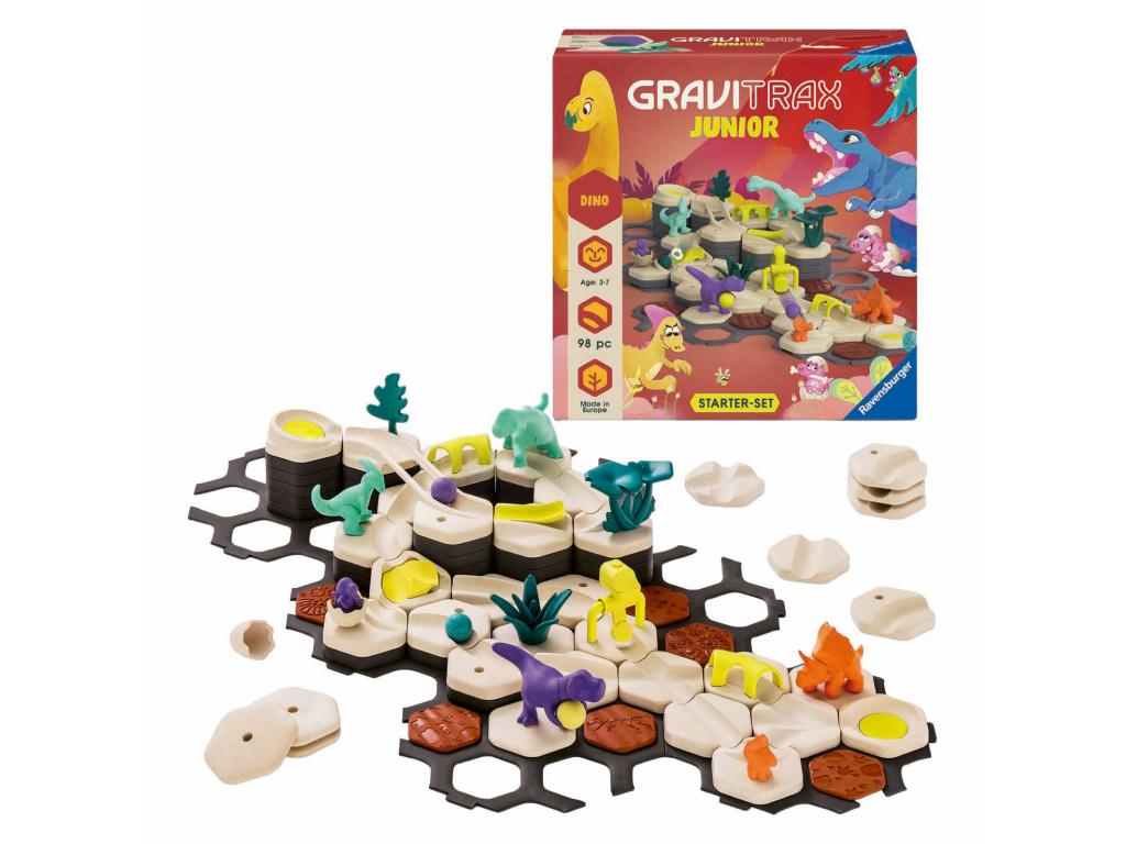 GraviTrax Junior kezdő szett dinoszaurusz motívummal, golyókkal, alagutakkal, kanyarokkal, váltókkal és dekorációs elemekkel. Bioplasztikból készült. 3 éves kortól alkalmas.