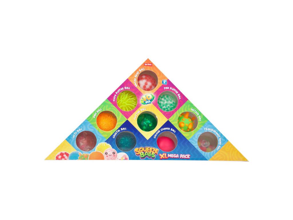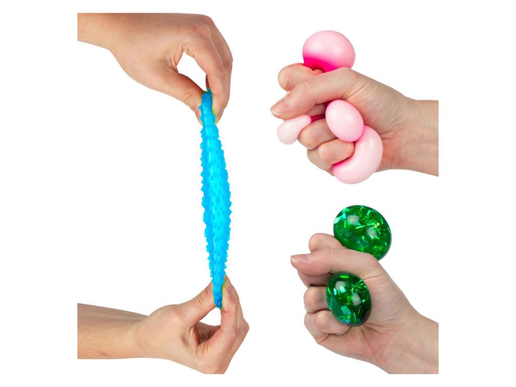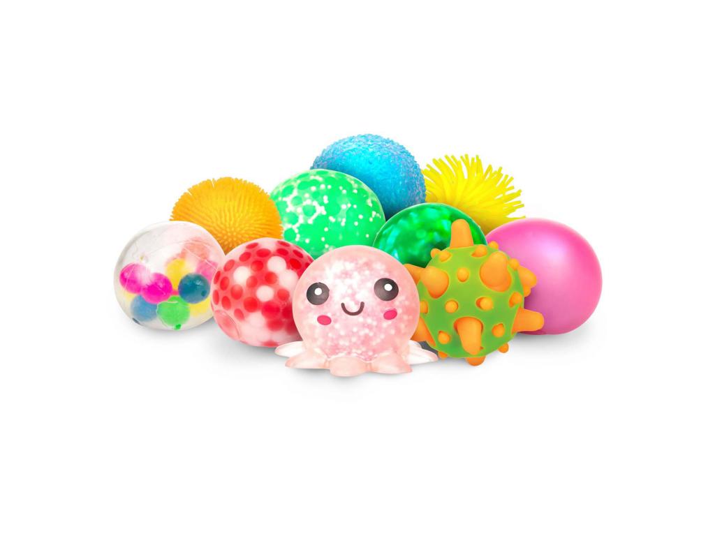 10 darabos szett érzékszervi nyomógolyókkal, mindegyik kb. 5 cm hosszú, különböző textúrával és töltelékkel. Műanyagból és szilikonból. 3 éves kortól alkalmas.