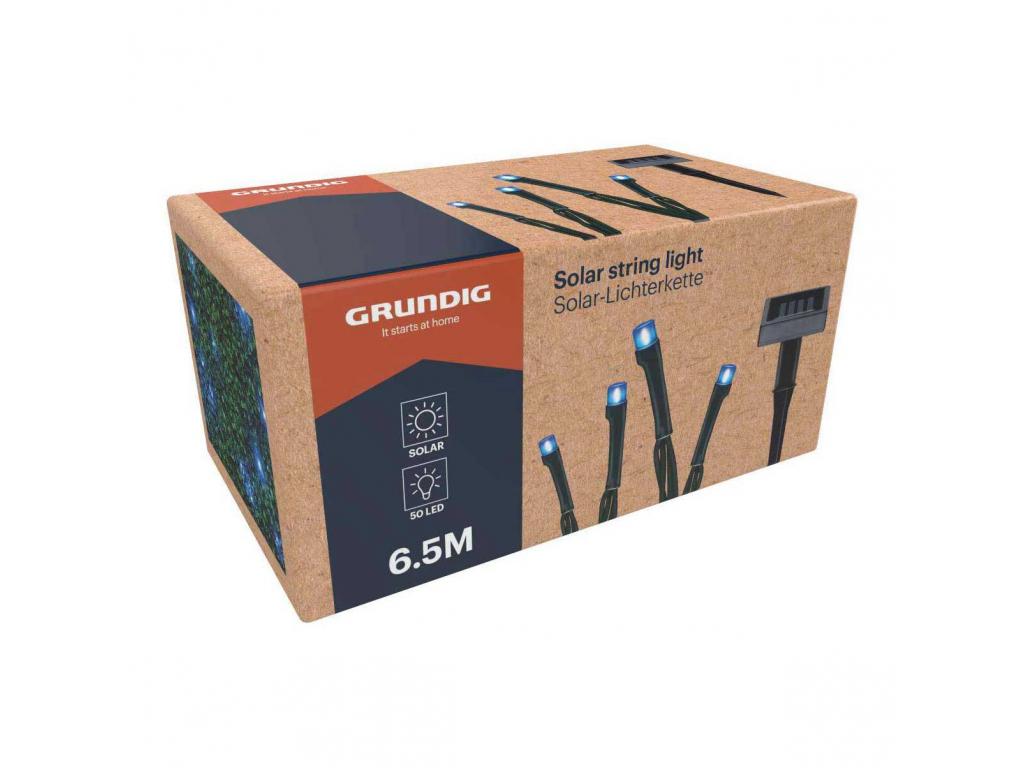Napelemes fényfüzér 50 kék LED-del. A fényfüzér hossza 6,5 méter, kültéri használatra alkalmas.
