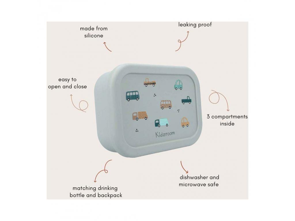 Milyen aranyos ebéddoboz! Ez a gyönyörű ebéddoboz a Kidzroom Lovely Lunch kollekciójából igazi must-have a gyerekek számára. Az ebéddoboz stílusos zöld színű és autós mintával díszített. A puha szilikon anyagának köszönhetően az ebéddoboz könnyen nyitható és zárható, így tökéletes kisgyerekek számára. A belső tér három rekeszre van osztva, így az ebéd minden összetevőjét áttekinthetően és frissen tárolhatja. A szilikon anyag miatt mikrohullámú sütőben és mosogatógépben is használható. Praktikus és aranyos! Töltse ki még ma választékát ezzel a bájos ebéddobozzal a Kidzroom-tól.