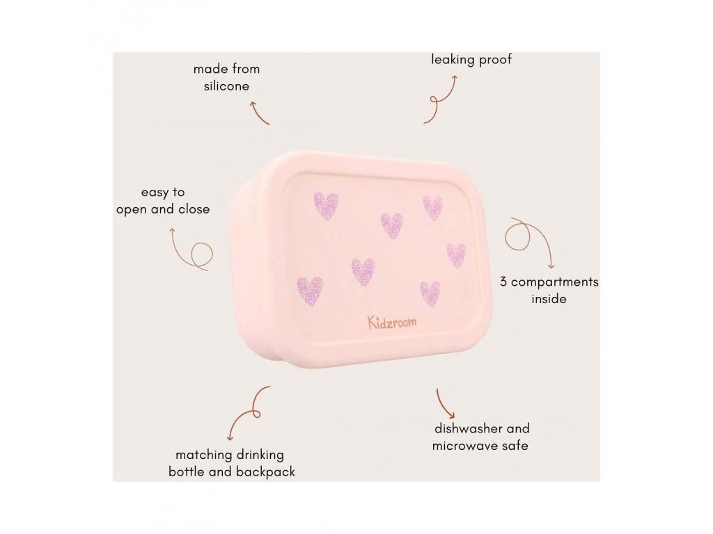 Milyen aranyos ebéddoboz! Ez a gyönyörű ebéddoboz a Kidzroom Lovely Lunch kollekciójából igazi must-have a gyerekek számára. Az ebéddoboz stílusos rózsaszínű és szívmintával díszített. A puha szilikon anyagának köszönhetően az ebéddoboz könnyen nyitható és zárható, így tökéletes kisgyerekek számára. A belső tér három rekeszre van osztva, így az ebéd minden összetevőjét áttekinthetően és frissen tárolhatja. A szilikon anyag miatt mikrohullámú sütőben és mosogatógépben is használható. Praktikus és aranyos! Tegye még ma teljessé választékát ezzel a bájos ebéddobozzal a Kidzroom-tól.