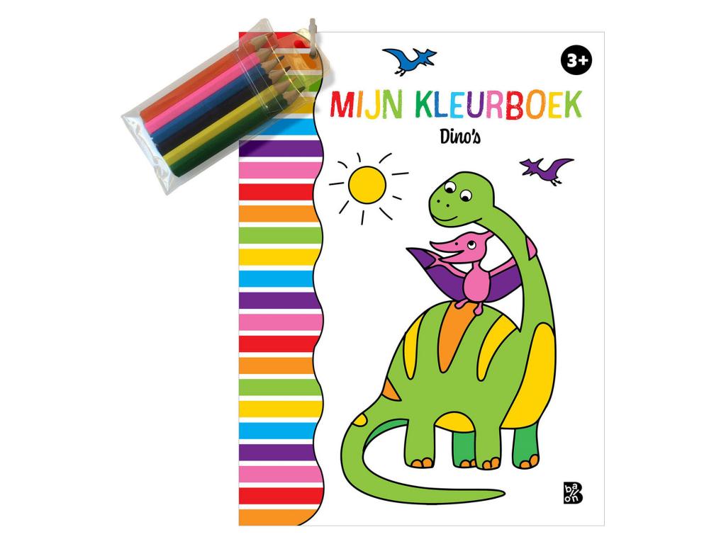 Dinoszauruszos kifestőkönyv 6 színes ceruzával. Világos rajzokat tartalmaz papíron, 3 éves kortól alkalmas.