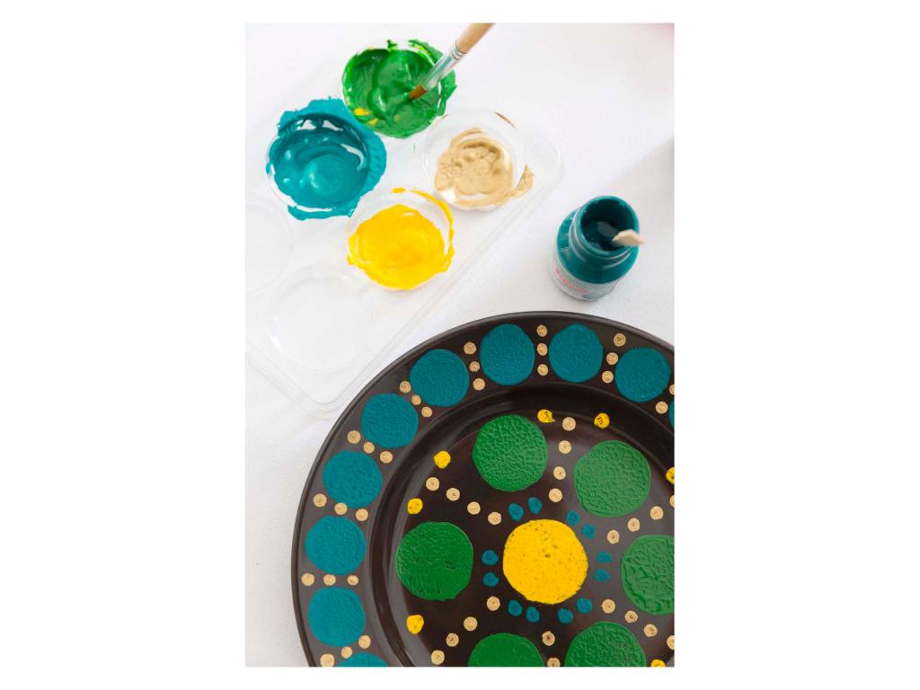 - A festéket egyenletes fedés érdekében szivaccsal vagy lapos ecsettel vigye fel. Finom részletek, pontok és vonalak hozzáadásához ceruzát vagy kis ecsetet is használhat.
