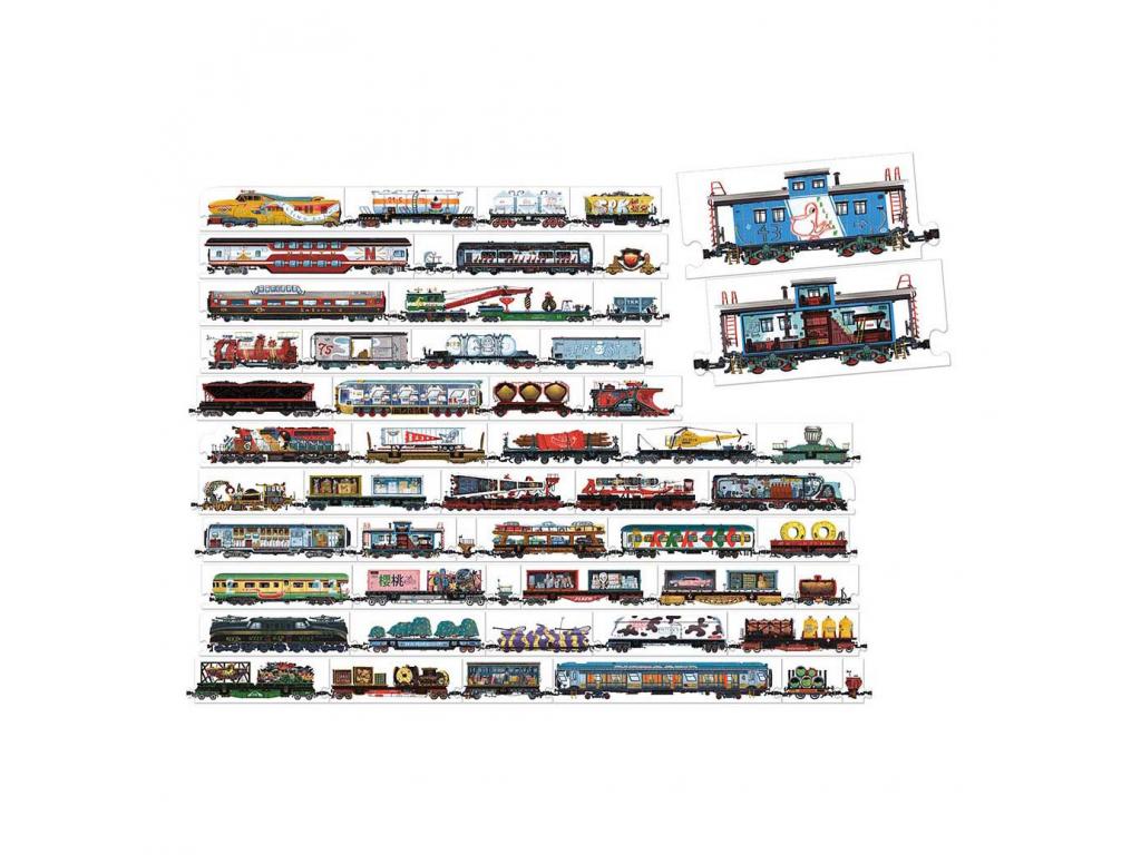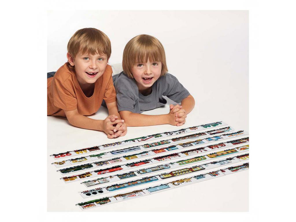 A kétoldalas Mix & Match Puzzle Trains készlet nemcsak a kisgyerekeket, hanem minden korosztályt játékra ösztönöz! Az innovatív kialakítás lehetővé teszi, hogy a darabokat tetszőleges módon illessze össze, ami igazán kreatívvá teszi ezt a puzzle készletet. Ezenkívül a kétoldalas darabokkal és a részletes illusztrációkkal felfedezheti a mozdonyok és kocsik külsejét és belsejét is. Rakja össze a puzzle-t, és játsszon a saját szabályai szerint! Nézze meg alaposan az illusztrációkat, és vessen egy pillantást a vonatok belsejébe. Készítsd el a saját vonataidat, például színekkel jelölve őket, vagy a szállított rakomány típusa alapján. Vagy... ahogy csak akarod! Engedd szabadjára a fantáziádat! Építs egy vonatot az összes darabbal. Rajzolj saját kocsikat és mozdonyokat. Készíts elő néhány kockát vagy agyagot, hogy szimuláld a rakományt. Ez a készlet remek lehetőséget kínál arra, hogy felkeltse a gyerekek érdeklődését a technika, a találmányok és a közlekedés története iránt. Hallottuk, hogy még a felnőtt vasútrajongók is imádják ezt a készletet!