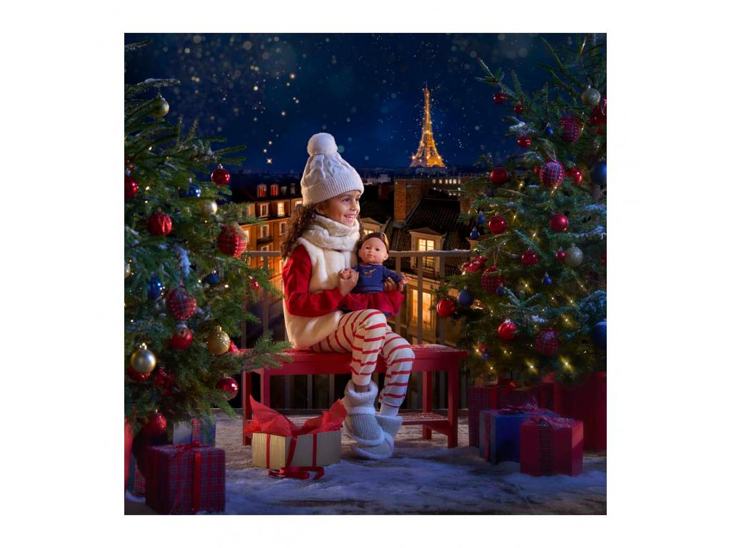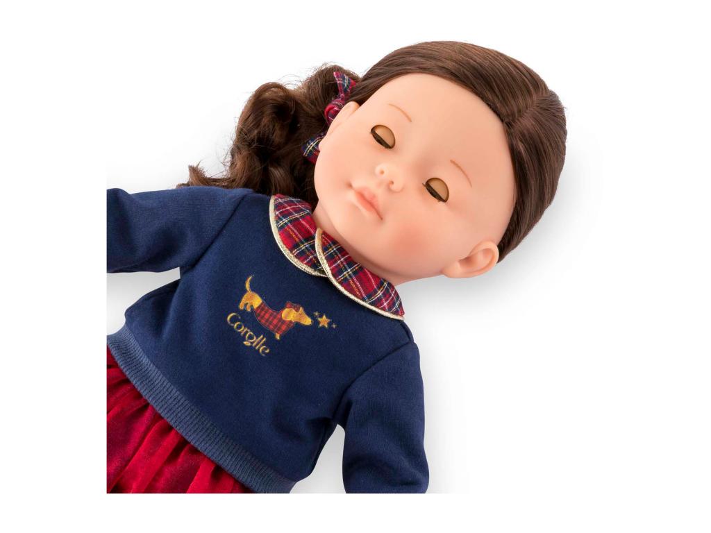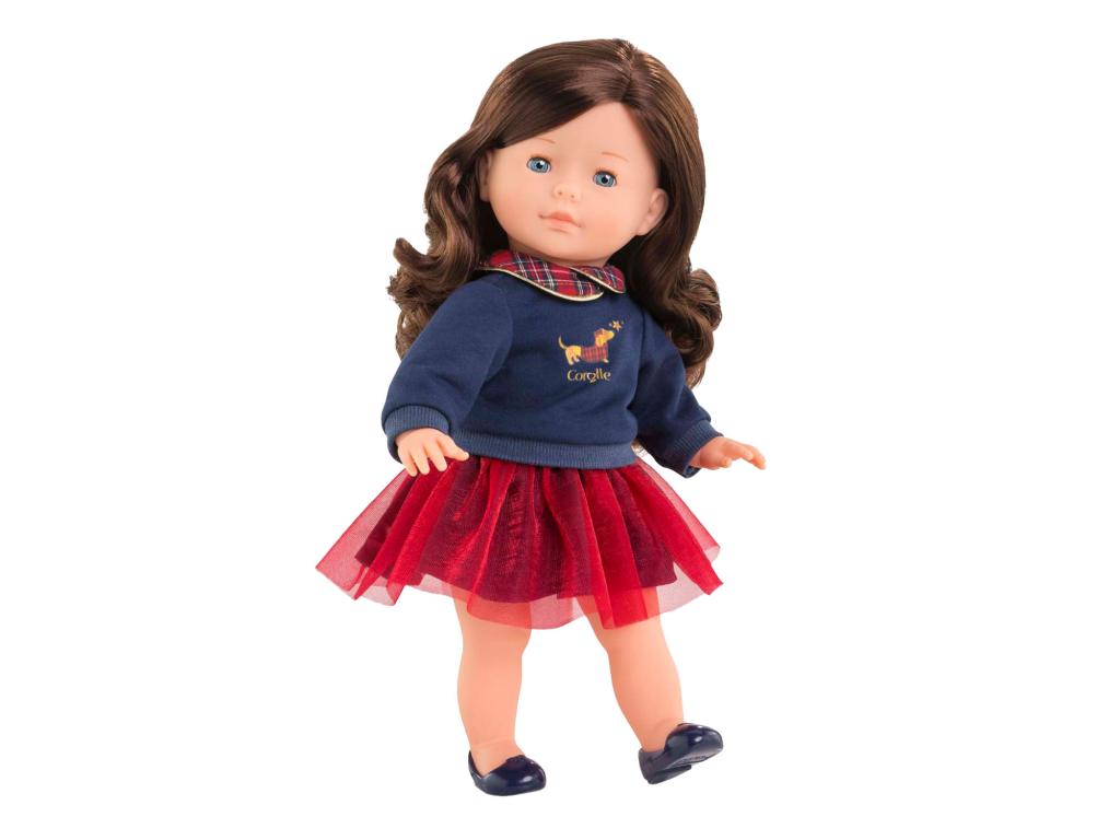 Corolle baba ünnepi téli ruhában. A baba 36 cm magas, barna hajú és álmos szemű, amelyek bezáródnak, ha lefektetik.