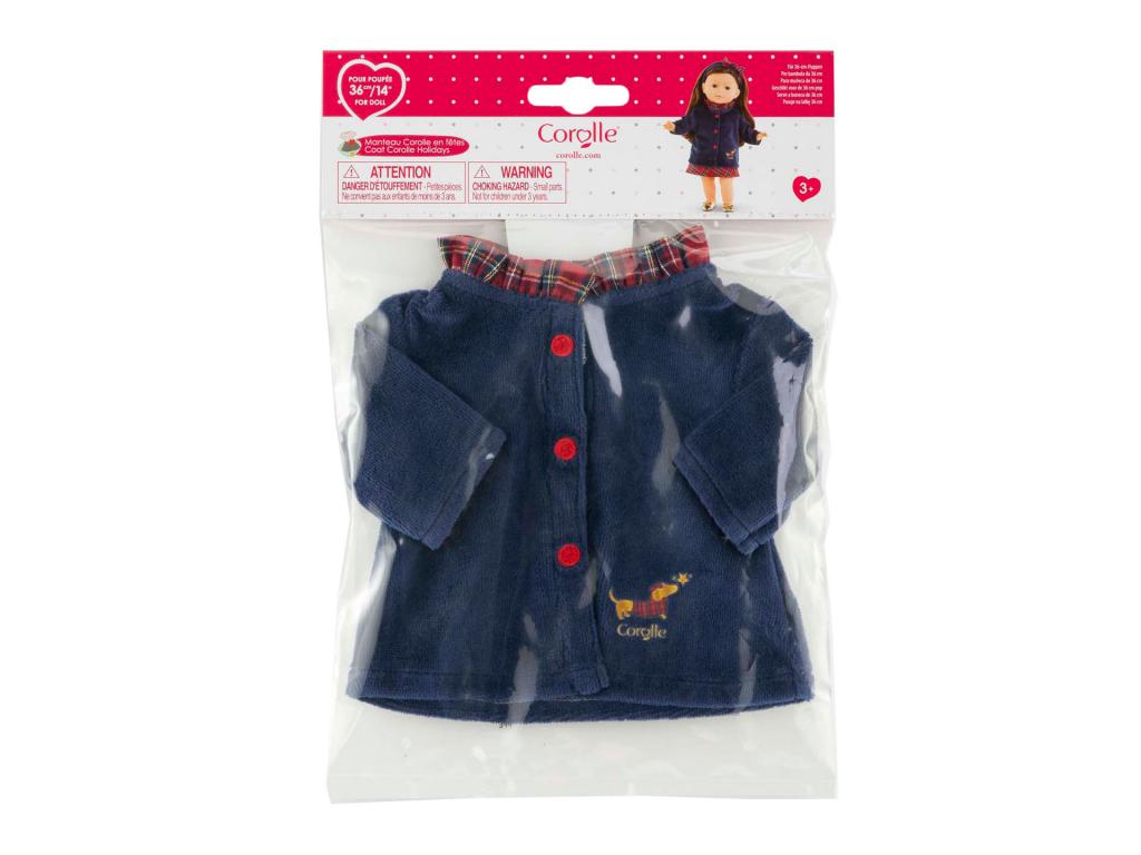 Sötétkék kabát piros kockás gallérral 36 cm-es Corolle babáknak. Kiegészítők nélkül, tépőzáras. 3 éves kortól alkalmas.