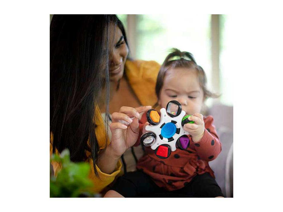 Forgó alkatrészekkel, pop-it buborékokkal, csörgőkkel és kontrasztos mintákkal ez a játék számtalan lehetőséget kínál a fogáshoz, nyomáshoz és felfedezéshez. A hat egyedi tevékenység az egész gyűrűn elosztva található, így a baba mindkét kezével egyszerre játszhat. Ideális a korai koordinációs képességek fejlesztéséhez.