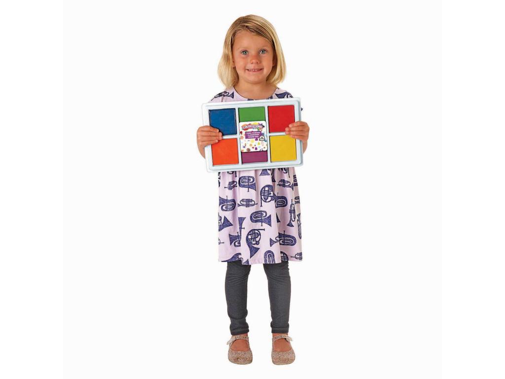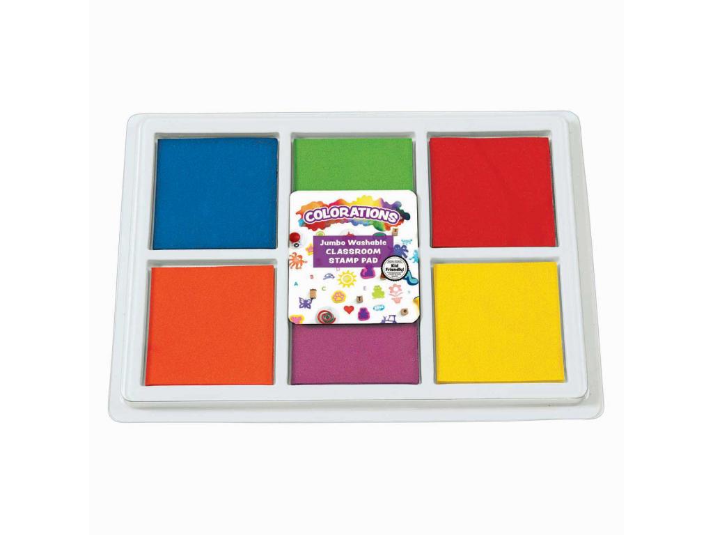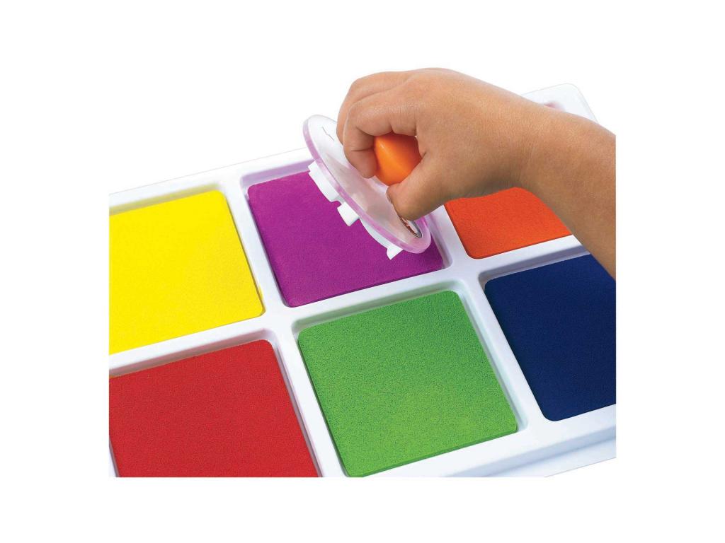 Hat élénk színű, lemosható tinta egy praktikus tálcában. Színek: kék, zöld, magenta, narancs, piros és sárga. A tálca mérete 28 cm x 19,5 cm x 13,5 cm. Minden bélyegzőpárna mérete 7,5 cm. A fedél megakadályozza a kiszáradást.
