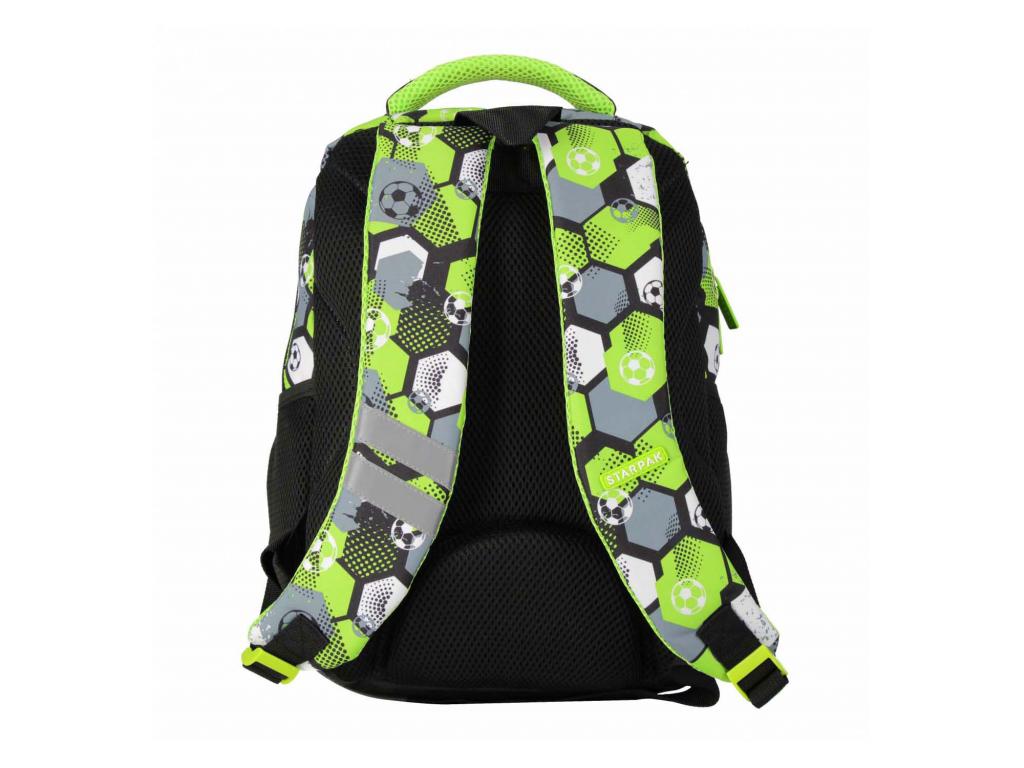 Fekete-zöld STARPAK hátizsák két fő rekesszel, egy nagy elülső zsebbel és egy kerek zsebbel. Oldalsó zsebekkel, fényvisszaverő részletekkel és párnázott pántokkal rendelkezik. Textilből készült, mérete 40 x 29 x 20 cm, űrtartalma 23 liter. 3 éves kortól alkalmas.