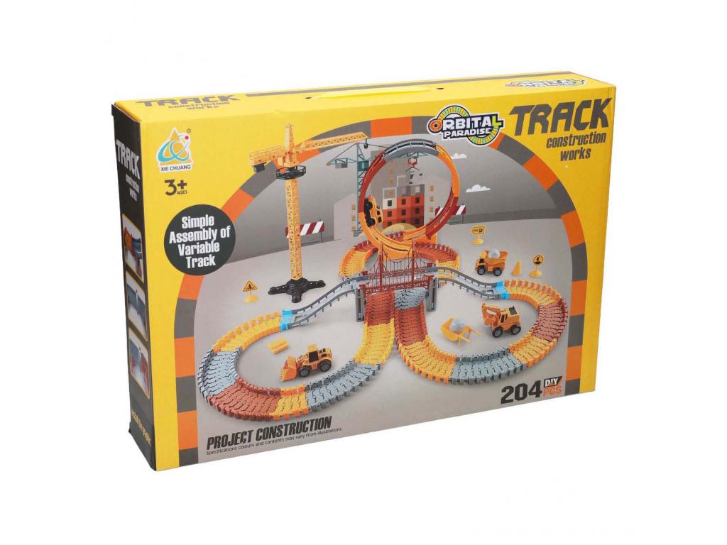 Ez a 204 darabos játékkészlet műanyag építősínpályát tartalmaz híddal, hurkával, daruval és járművekkel. A kiegészítőkkel, mint például deszkák és kúpok, minden alkalommal más játék környezetet lehet kialakítani. 3 éves kortól alkalmas.