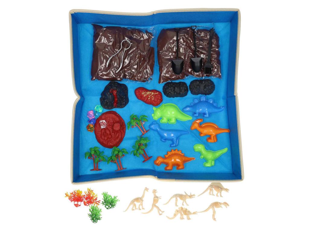 Ez a játékkészlet 1000 gramm barna játékhomokot, különböző dinoszauruszfigurákat, vulkánokat, fosszíliákat, szerszámokat és formákat tartalmaz. Minden egy praktikus dobozban, játékszőnyeggel együtt kerül kiszállításra. Homokból és műanyagból készült. 3 éves kortól alkalmas.