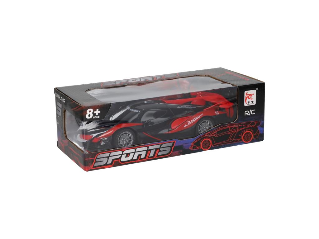 Piros-fekete RC versenyautó távirányítóval. Műanyagból. 8 évesnél idősebb gyermekek számára alkalmas.