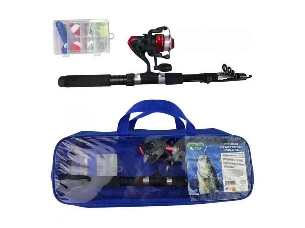 Game on Fishing Deluxe kezdő szett. A szett egy 2,10 m hosszú teleszkópos horgászbotot, egy horgászorsót zsinórral és horgász kiegészítőket tartalmaz egy horgász dobozban. A szett tárolótáskában kerül kiszállításra. Teljes színes betéttel ellátva.