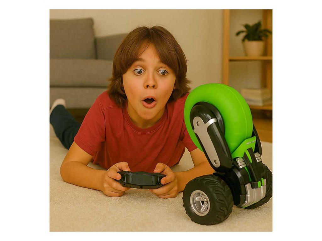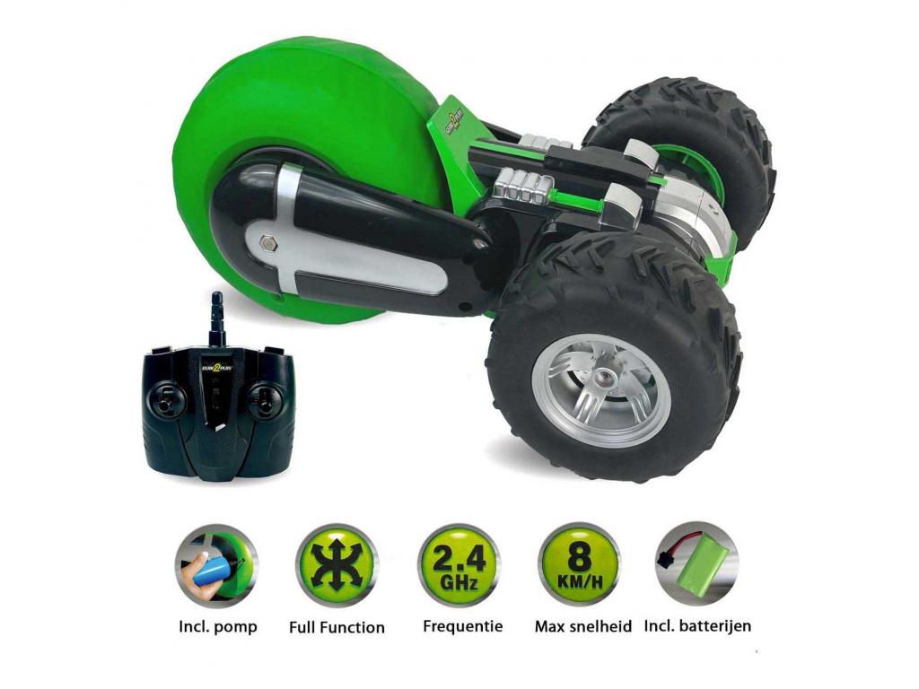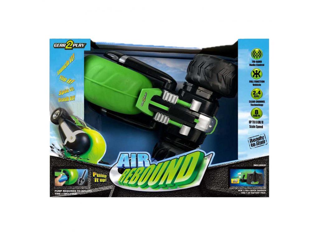 Ismerje meg a Gear2Play RC Air Reboundot, a látványos fekete-zöld háromkerekű kaszkadőrautót! Egyedülálló kialakítása, két robusztus hátsó kerékkel és egy nagy felfújható első kerékkel teszi ezt az autót akcióautóvá. Szaltók, pörgetések és ugrások akadályok, lépcsők és falak felett semmi sem állíthatja meg ezt a kaszkadőautót! A vezérlővel 360°-os forgásokat, menő wheelie-ket és kaszkadőrök három keréken hajthat végre. Az első kerék elnyeli az ütéseket és erőteljesen visszapattan és a mellékelt pumpa segítségével mindig készen áll a használatra. Ez a gyors szórakozás! Korhatár: 8 év felett. Azonnal használatra kész: az elemek a csomagban megtalálhatók így azonnal indulhat! Az autó egy nagy teljesítményű, mellékelt 7,4 V-os akkumulátorral működik, és USB-n keresztül tölthető. A vezérlőhöz 2 AA elem szükséges (a csomagban megtalálható). A jármű méretei: 30 x 24 x 15 cm (H x Sz x M).