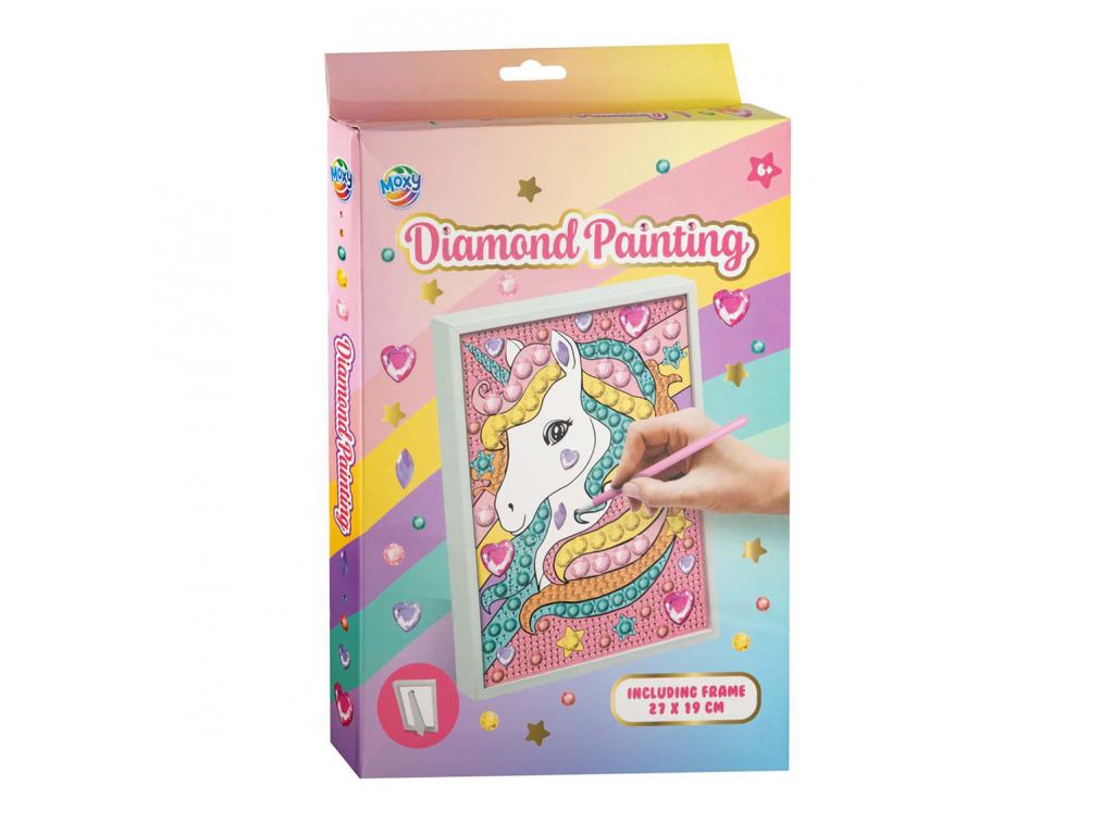 Gyémántfestő készlet egyszarvúval és 27 x 19 cm-es kerettel. Tartalmazza a köveket, a tollat és az útmutatót. 6 éves kortól alkalmas.