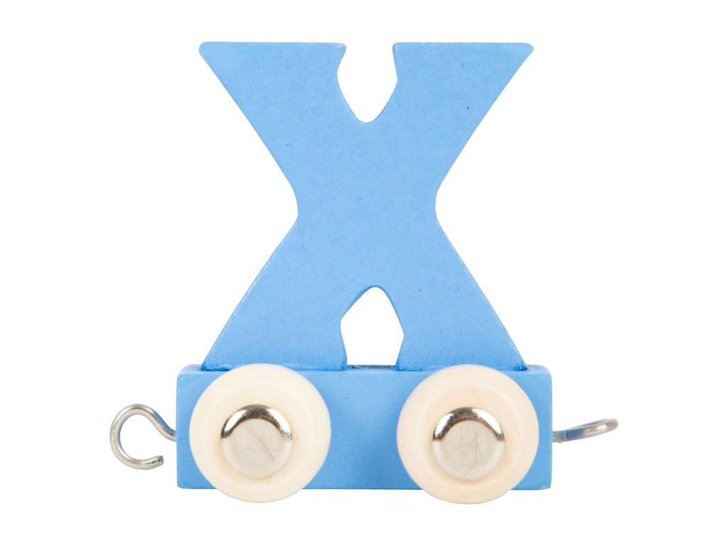 Ez a fa pótkocsi a kék X betűvel bármely névhez hozzáadható. A készlet 12 betűkocsit tartalmaz, méretük kb. 6 x 3 x 5,5 cm.