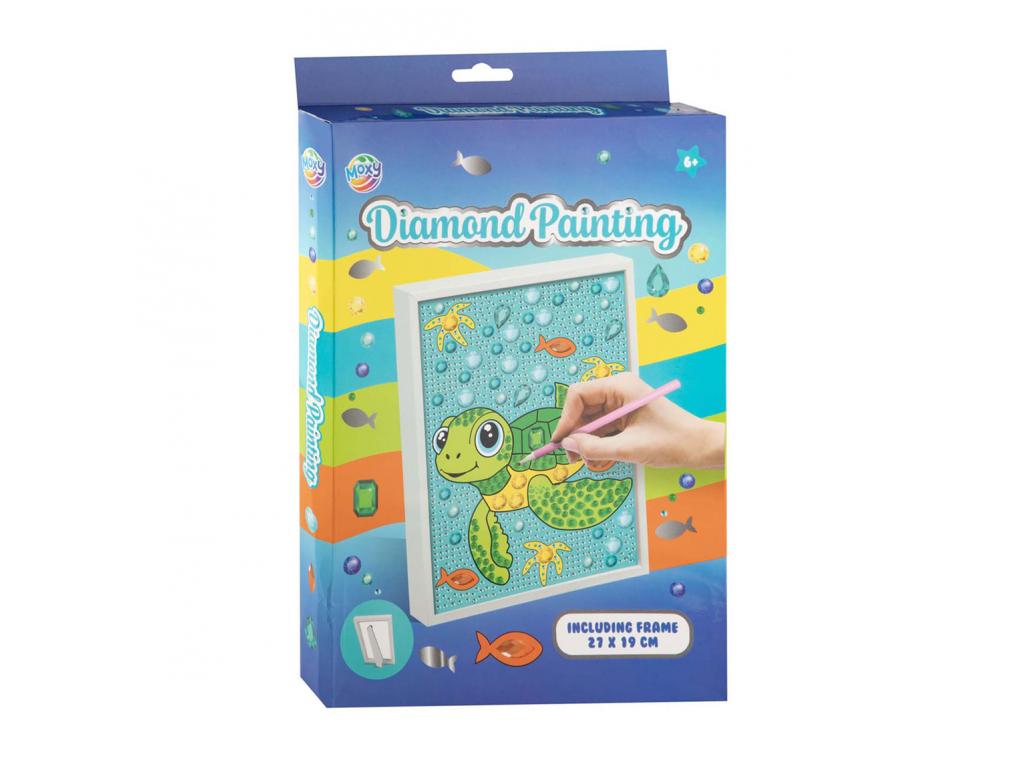 Gyémántfestő készlet teknős motívummal és 27 x 19 cm-es kerettel. Tartalmazza a köveket, a tollat és az útmutatót. 6 éves kortól alkalmas.