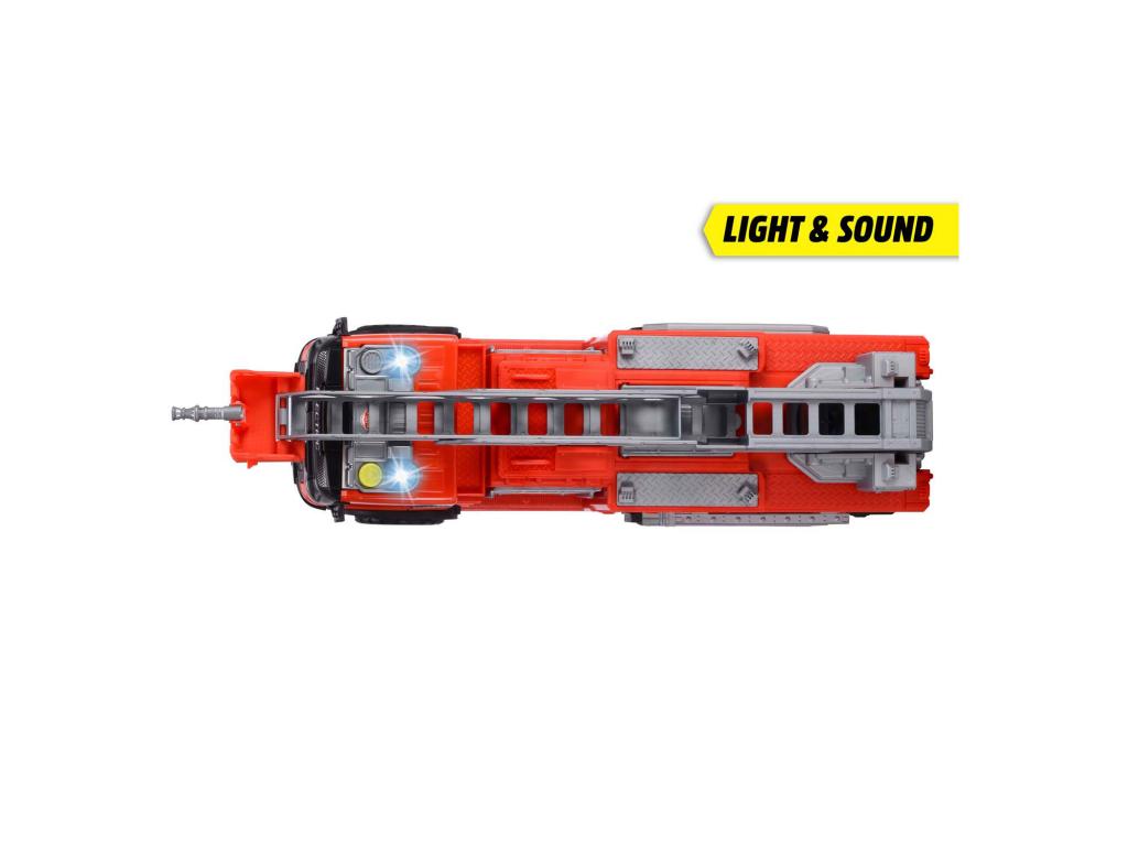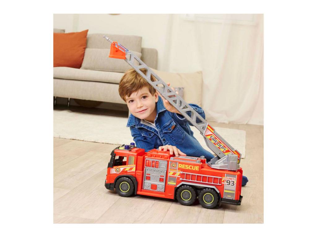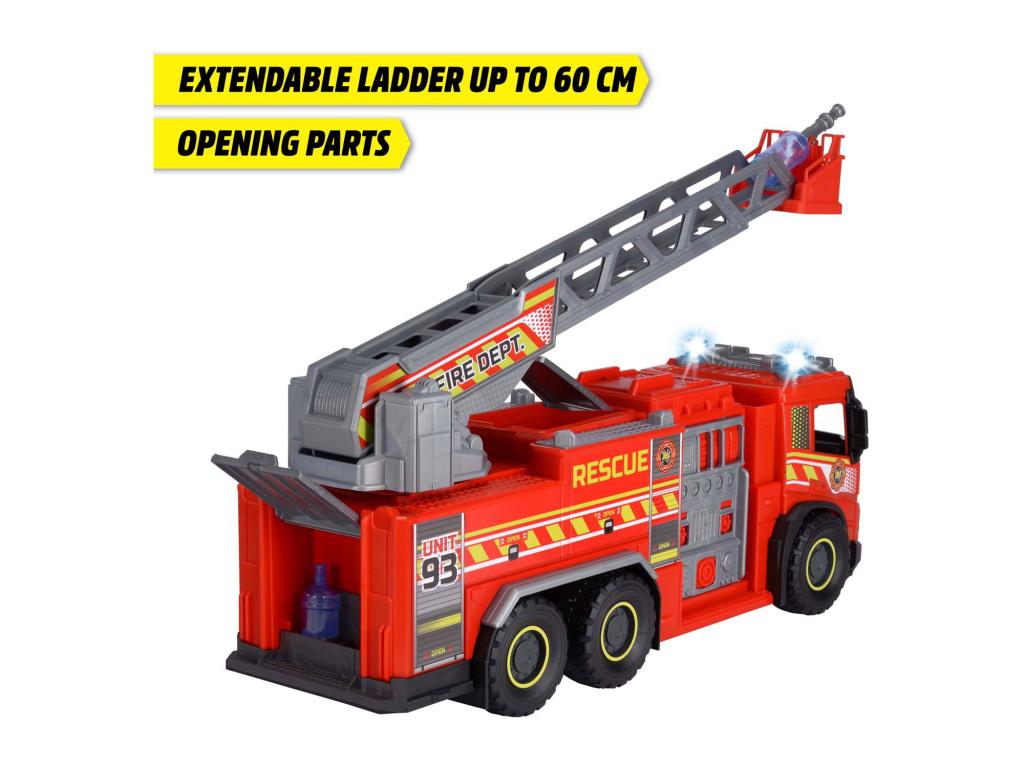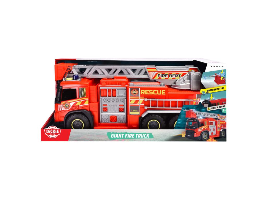 Hatalmas tűzoltóautó a Dickie Toys-tól, fényekkel, hangokkal és működő víztömlővel. Robusztus és játékra kész, 3 éves kortól alkalmas.