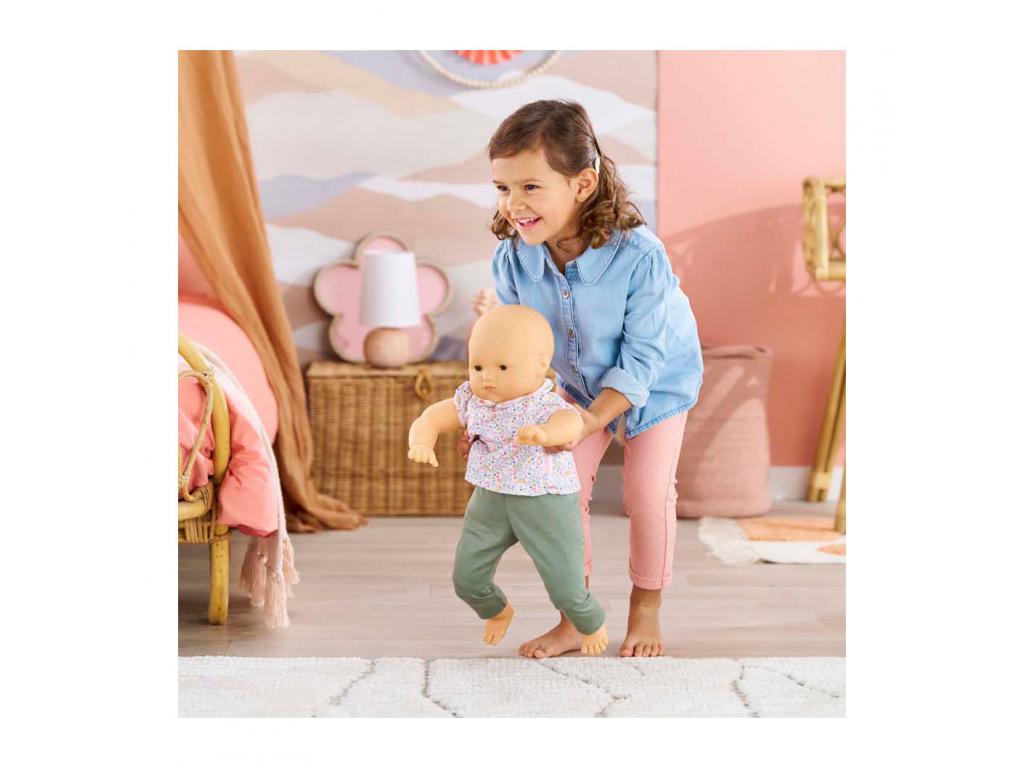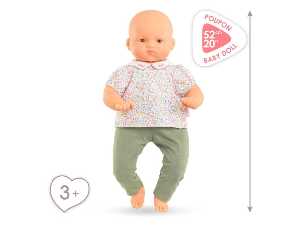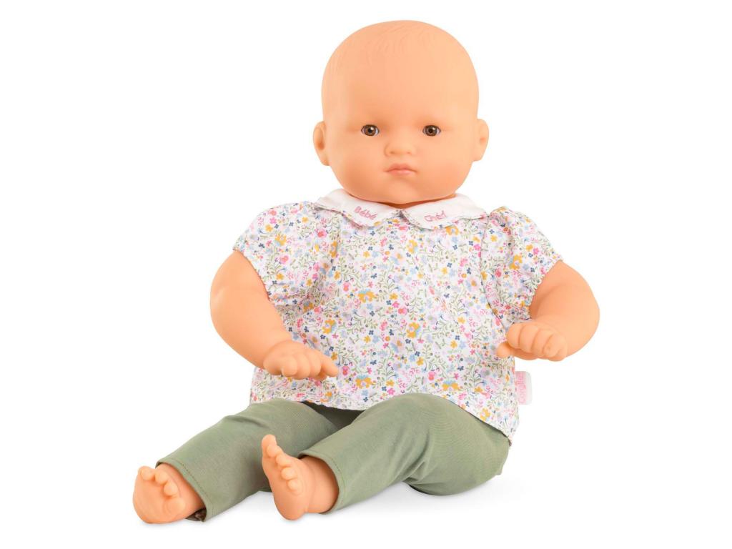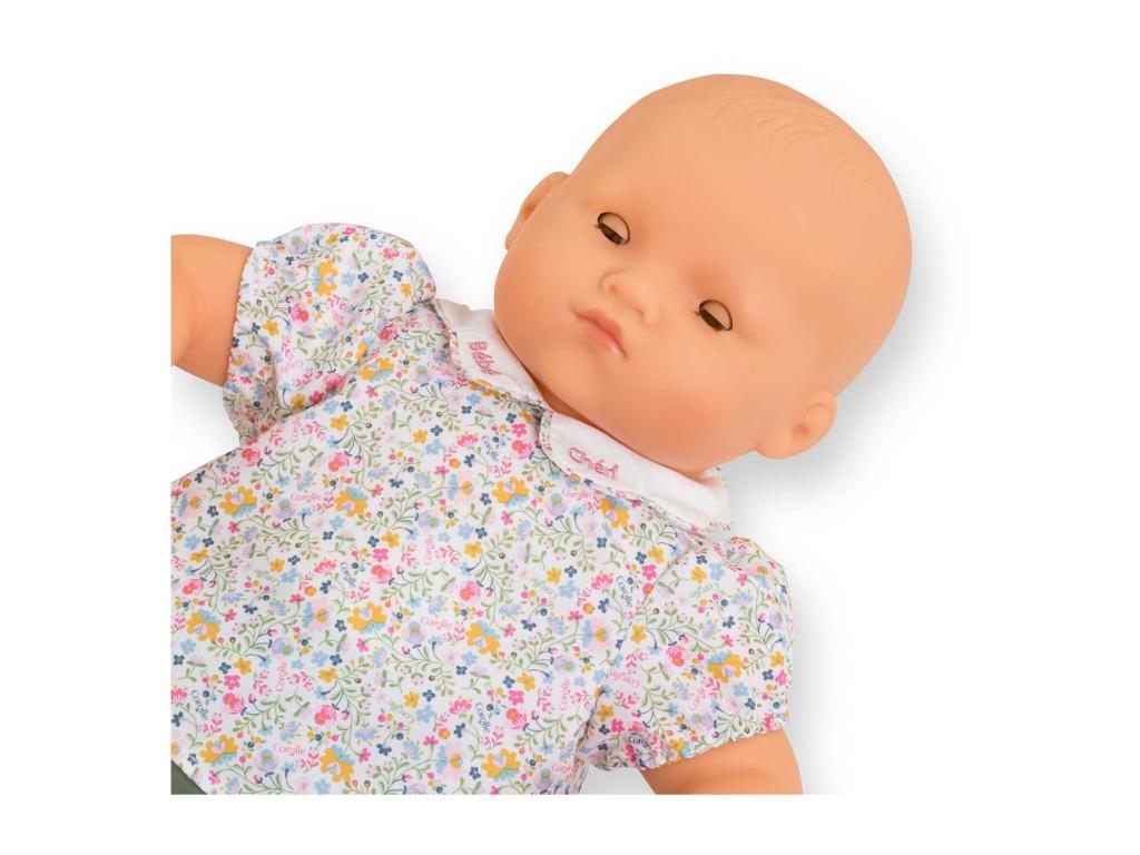 A Corolle Bébé Chéri babababa 52 cm magas, puha testtel és valósághű súlyú. Virágos blúz és zöld nadrág tartozik hozzá. 3 éves kortól alkalmas.