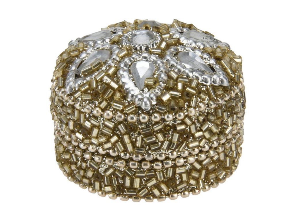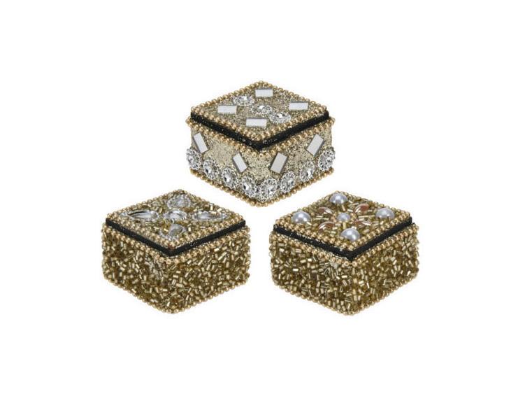 36 darabos arany tárolódoboz-készlet (4 x 3 cm méretű) fedéllel. A dobozok gyönyörű strasszokkal, műgyöngyökkel és gyöngyökkel vannak díszítve. A készlet 3 különböző kerek és 3 különböző négyzet alakú mintát tartalmaz.