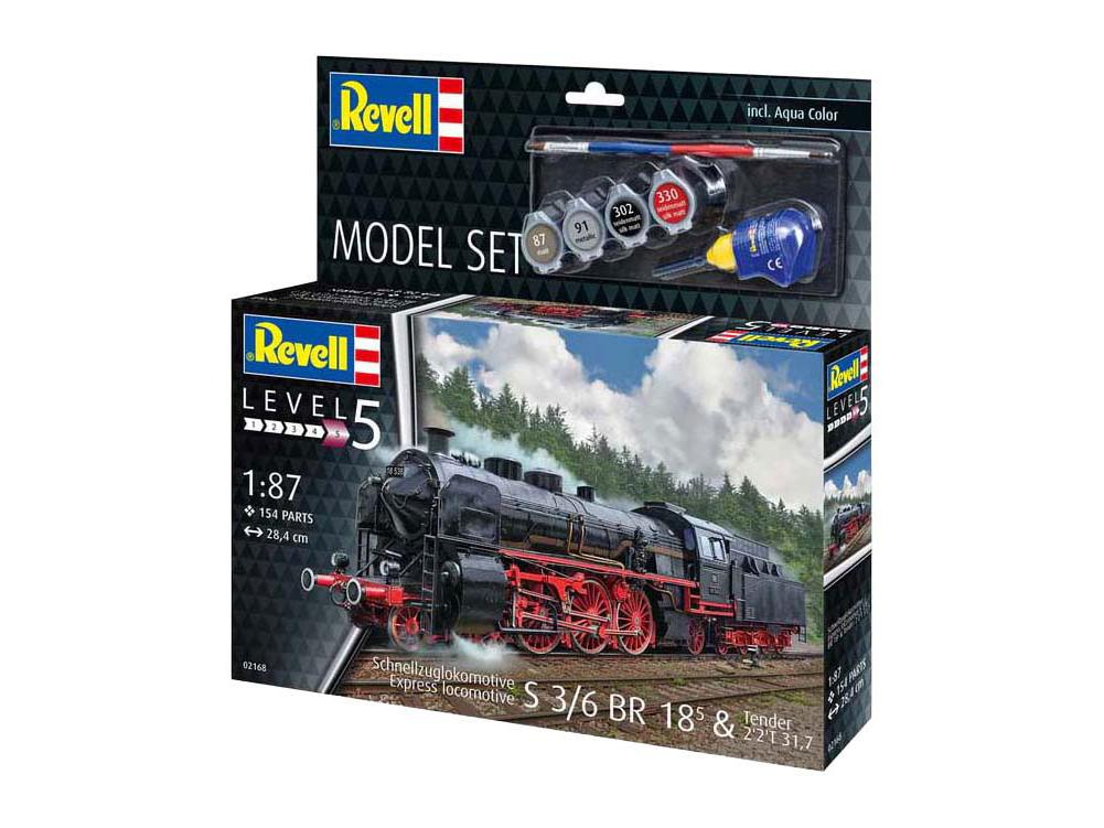 Részletes Revell modellező készlet az S3/6 BR18(5) mozdonyhoz 1:87 méretarányban. Festékkel, ragasztóval, ecsettel és matricákkal együtt. Klasszikus vonatmodell 154 alkatrésszel igazi vasútrajongóknak.
