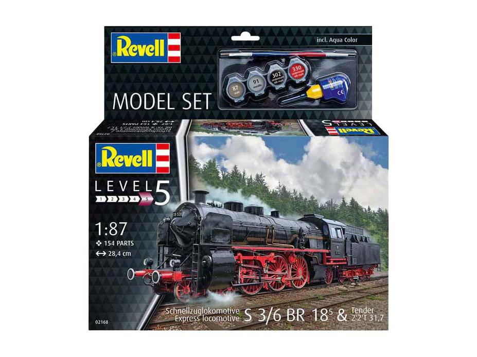 A Revell modellező készlet S3/6 BR18 gyorsvonat-mozdony szénszállító kocsival 1:87 154 darabos leírása: