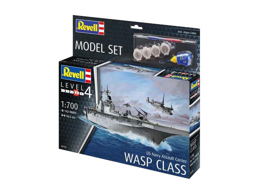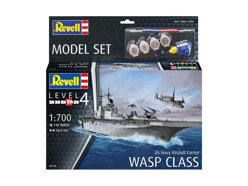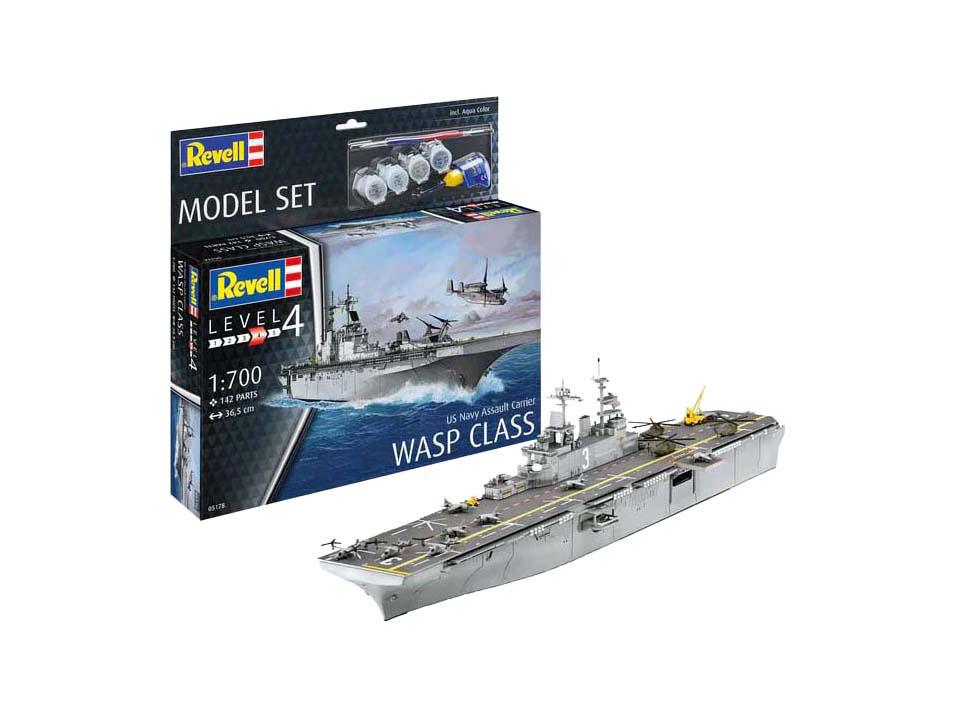 Revell modellező készlet Amerikai Haditengerészet WASP osztályú támadó hordozó 1:700 142 alkatrész.