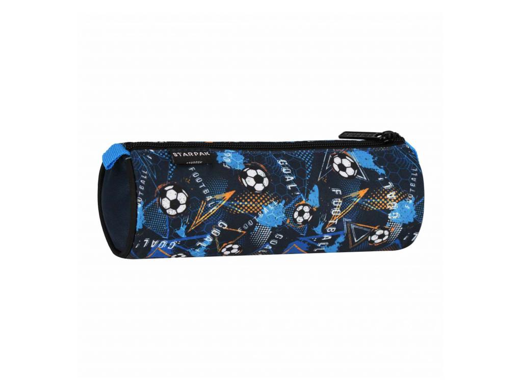 Cső alakú tolltartó sötétkék színben, menő foci mintával. Méretek: 22 x 8 centiméter.