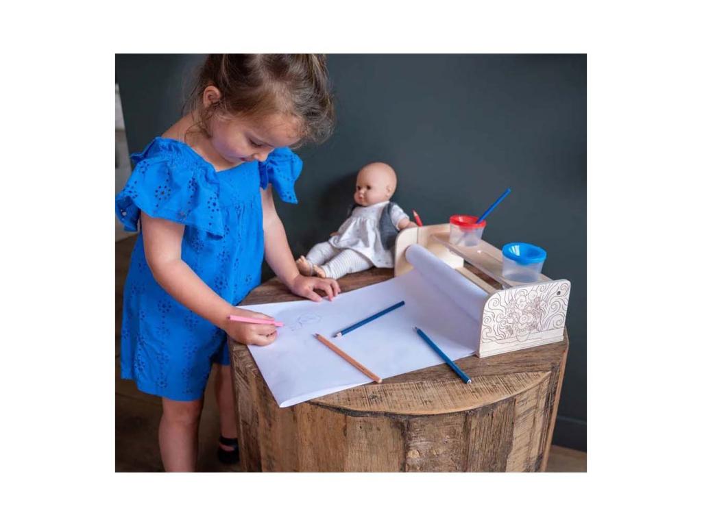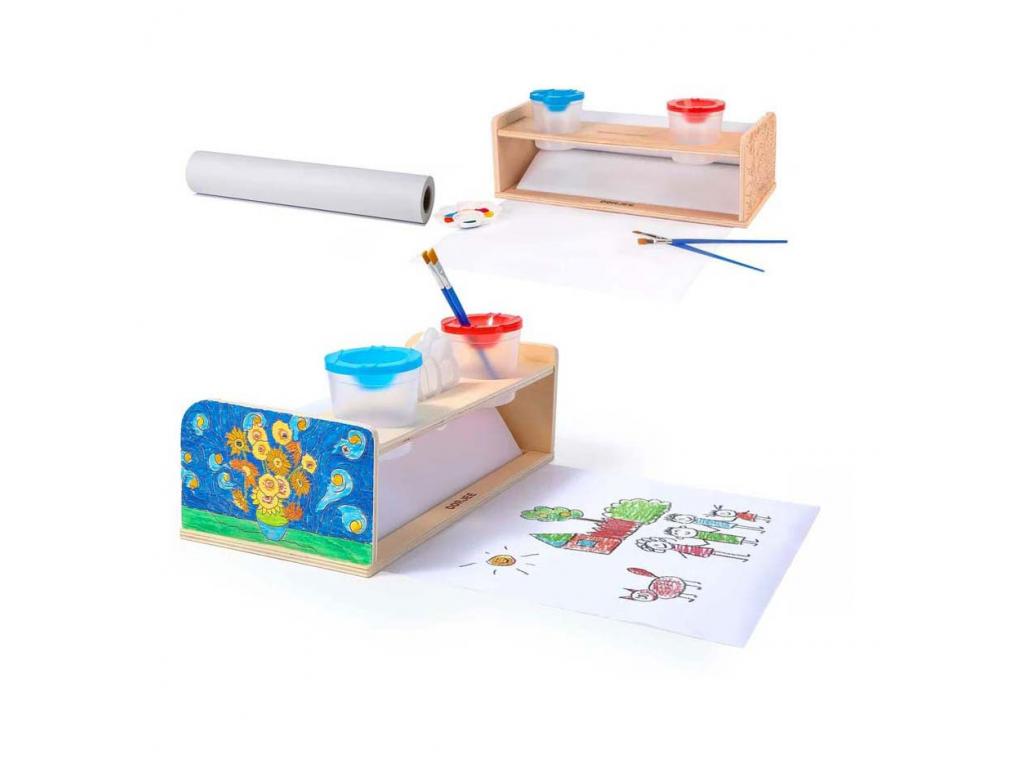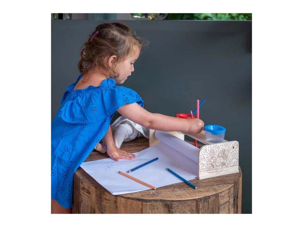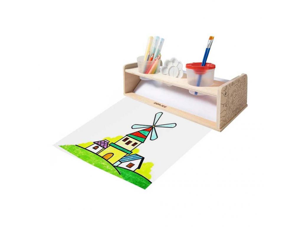 A Dorjee fa papírtekercstartó tömör fából készült. Tartalmaz mindent, amire szükség van a kézműveskedéshez: egy kiváló minőségű papírtekercset, festéktartót, ecsetet és festőpalettát.