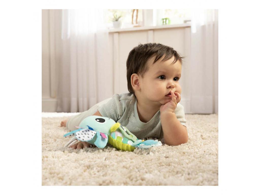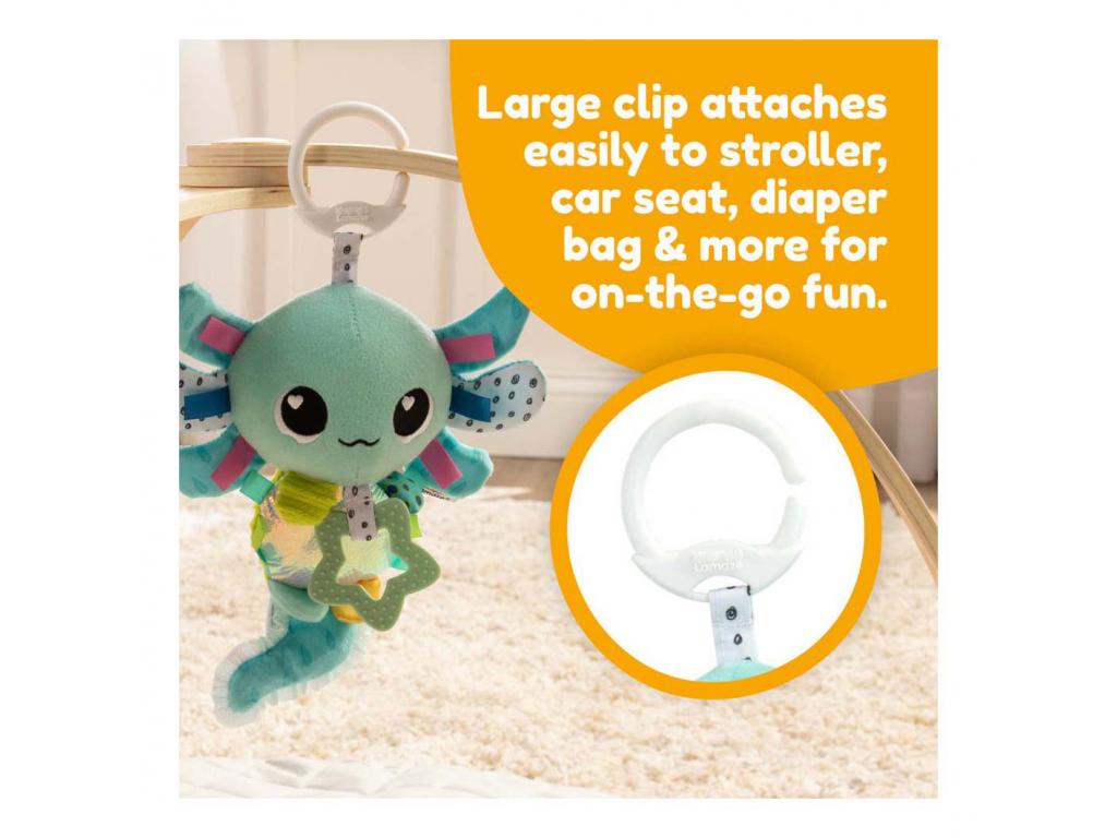A Lamaze Alise az axolotl egy meglepő játék, vicces hangokkal, amely végtelen szórakozást nyújt babájának. Az axolotl egy nagyon különleges szalamandra, széles fejjel és apró szemekkel, közvetlenül a feje mögött három pár külső kopoltyúval. Babája imádni fogja Alise kontrasztos formáit és színeit felfedezni. A recsegő hang, amikor babája megnyomja a recsegő farkát, magával ragadja majd, és tökéletes az ok-okozati összefüggések megtanulásához. Ha pedig ide-oda rázza, lágy csörgést hallhat. Babája megérintheti az összes rejtett textúrát, és rágcsálhatja a csillag alakú rágókát. A praktikus akasztóklipsznek köszönhetően Alise bárhová magával vihető a babakocsiba vagy a pelenkázótáskába. Születéstől kezdve alkalmas csecsemők számára.