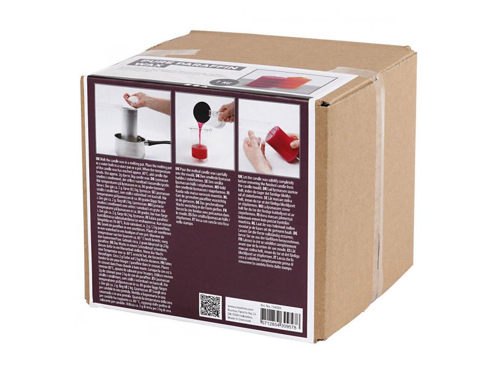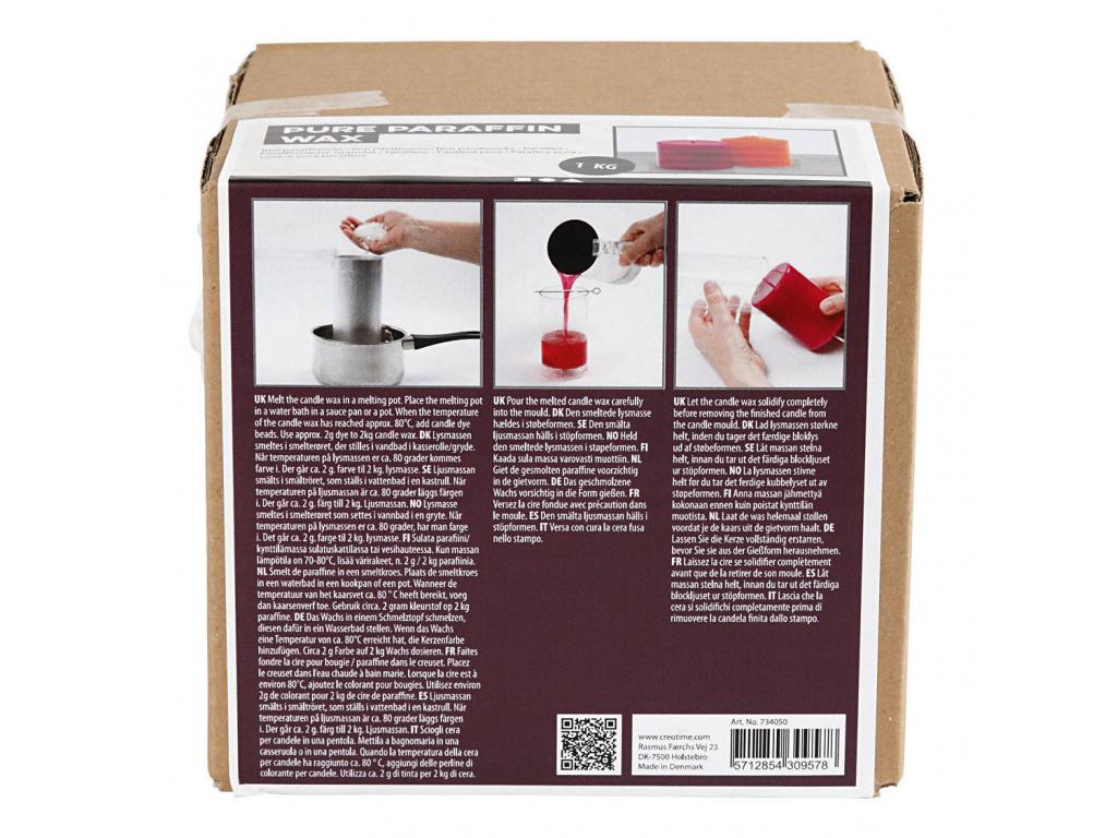 Paraffinviaszgyöngyök, 100 % finomított. Ez az öntőanyag merített és öntött gyertyákhoz egyaránt alkalmas. 6070 °C-os vízfürdőben megolvasztani, majd gyertyaszínezéket hozzáadni. A gyertyaviaszt vízfürdőben, edényben megolvasztani: vizet önteni az edénybe, és egy fém vagy üveg olvasztótégelyt belehelyezni. Tegye a gyöngyöket az olvasztótégelybe, és egy hőmérővel figyelje a hőmérsékletet, amíg el nem éri a kívánt hőmérsékletet (max. 80 °C). Öntött gyertya hőmérséklete: 60 °C. A mártott gyertya hőmérséklete: 70 °C. A gyertya viaszának megolvasztása termosztáttal szabályozott olvasztótégelyben (különböző méretek): Öntsön vizet a fazékba, helyezze bele az olvasztótégelyt a viaszgyöngyökkel, és állítsa be a hőmérsékletet a biztonsági termosztáton. Az olvasztótégely méretétől függően több órába is telhet, mire a viasz teljesen megolvad. Nagy, 2030 literes gyertya viasz befogadására alkalmas olvasztótégelyek esetén ajánlatos a viaszt 12 órával az öntés vagy merítés előtt megolvasztani. Szilárd gyertyák: Adjon gyertya színezéket az olvasztótégelyben megolvadt paraffin viaszhoz, és tartsa be a gyertya színezék csomagolásán található adagolási utasításokat. Hosszabb égési idő érdekében adjon sztearint a viaszhoz (maximum 15%). Tiszta formában vagy legfeljebb 15% sztearinnal keverve használható (73410 cikk). Olvadáspont: 60 °C. Ajánlott merítési hőmérséklet: 70 °C.