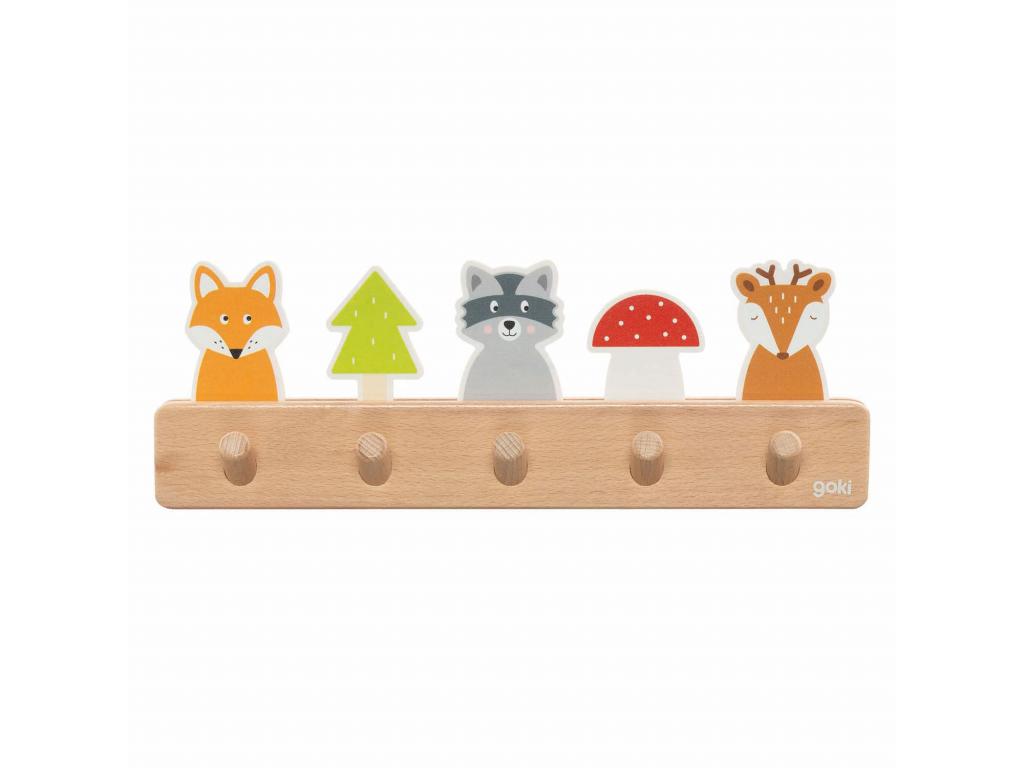 Goki fa ruhaakasztó erdőbarátokkal és 5 akasztóval. Méretek: 32,5 x 5,5 x 11,5 centiméter.
