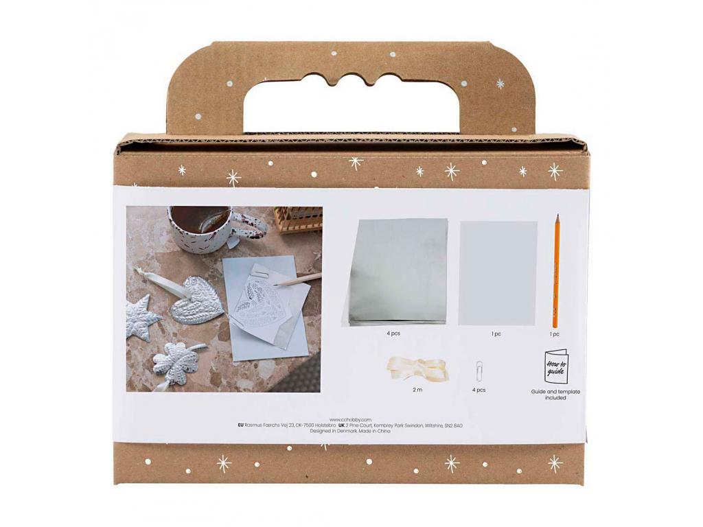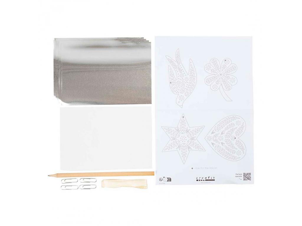A karácsonyi dekorációknak csillogniuk, ragyogniuk és fényleniük kell! Ez illik az Ön stílusához? Akkor ez a kézműves készlet pont az Ön számára való. Ezzel a készlettel gyönyörű, ezüst színű dombornyomott fóliából készíthet függő dekorációkat nagyon egyszerűen. Rajzolja meg a motívumot ceruzával, vágja ki, majd adjon hozzá további részleteket. Díszítse a dekorációkat szaténszalaggal, hogy karácsonyfára és ablakba is felakaszthassa őket.