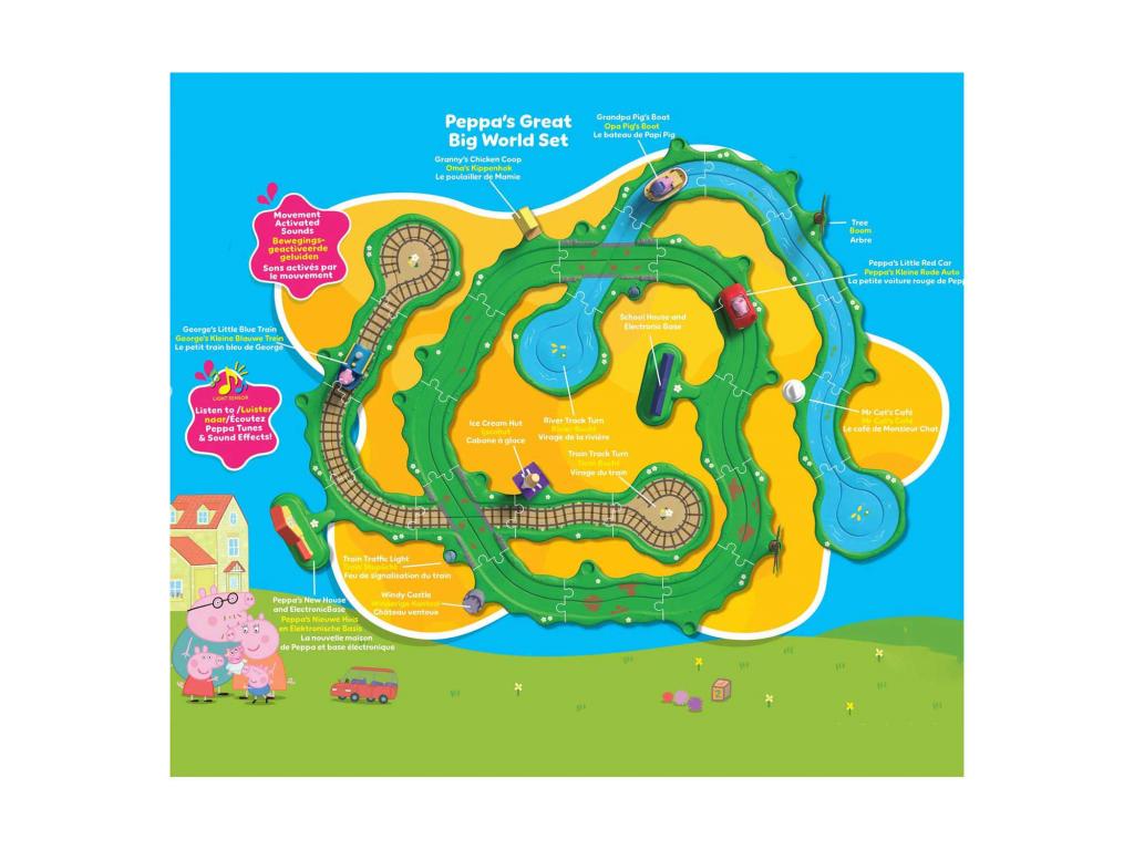 Lépj be Peppa BIG világába ezzel a hatalmas, interaktív Peppa Nagy Világa játékkészlettel. A mellékelt egyenesek, kanyarok és kiegészítők segítségével építs egy vidám és színes utat, hogy Peppa, George és Nagypapa végtelenül száguldozhassanak az úton, a síneken vagy a vízen. Kombinálja az alkatrészeket egy nagy pályává és máris kezdődhet a játék! A csomagban megtalálja Peppa legendás kis piros autóját, Schorsch kék vonatát és Nagypapa Wutz hajóját. Minden jármű elemmel működik és könnyen kezelhető. Aktiválás után önállóan haladnak az úton, a síneken vagy a vízen, és végtelen játékélményt nyújtanak. Töltsd ki ezt a hatalmas Nagy Széles Világ utat a mellékelt kiegészítőkkel, mint például Peppa új háza, az iskola, nagyi tyúkólja, a fagylaltozó, a szélkastély, a közlekedési lámpák, a fák, a fehér kerítések és Mr. Big Cat kávézója! És még több szórakozás: amikor a járművek elhaladnak Peppa házánál vagy az iskolánál, automatikusan hanghatások hallatszanak, például Peppa BIG vidám főcímdala és más vicces hangok, amelyek igazán életre keltenek a játékot.