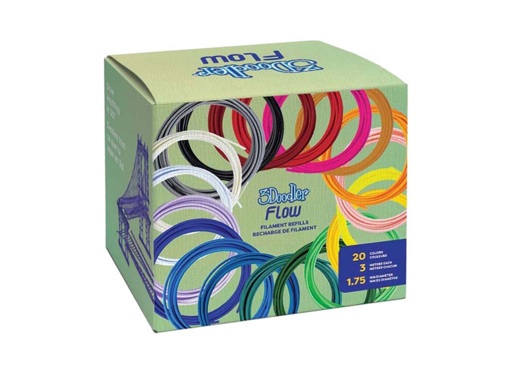 Ez a 3Doodler Flow utántöltő készlet 20 élénk színt tartalmaz, amelyekkel ötleteit kézzelfogható műalkotásokká alakíthatja. 20 tekercs PLA-filamentet tartalmaz különböző színekben, többek között cseresznye, piros, fukszia, arany, narancs, rózsaszín, citrom, sárga, zöld, erdőzöld, türkiz, kobaltkék, kék, sötétkék, lila, tiszta kék, tiszta fehér, fehér, szürke és fekete.