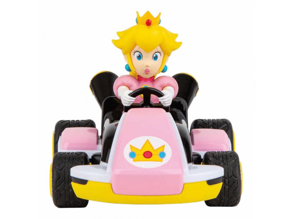 Ez a kompakt Peach mindenhova elkísér! A Carrera RC Mario Kart Race Kart 1:32 méretarányban mindössze 12 cm hosszú, így ideális izgalmas Mushroom Cup- vagy konyhaasztal-versenyekhez. Gumiabroncsai és Full Function kormánytechnológiája garantálja a 6 évesnél idősebb versenyzők számára az egyszerű irányítást és a pontos manőverezhetőséget még a legszűkebb helyeken is. Ez a Ready to Run kart azonnal használatra kész.